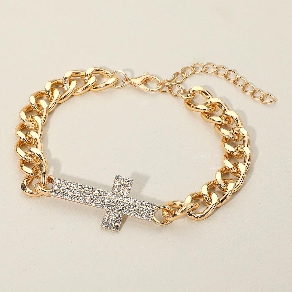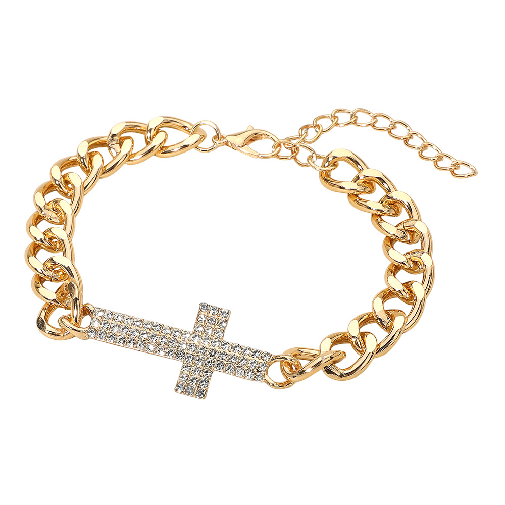 Details • Size : 0.8" H, 9.25" + 3" L • Lobster Clasp Closure • Add a refined touch to your look with this Cross Chain Bracelet, designed with a bold link chain and a sparkling rhinestone cross charm. Perfect for layering or wearing solo, this bracelet brings timeless elegance and modern sophistication to any outfit. • Lead and Nickel Compliant