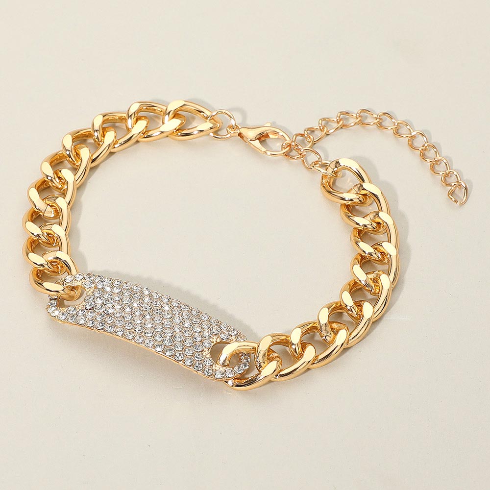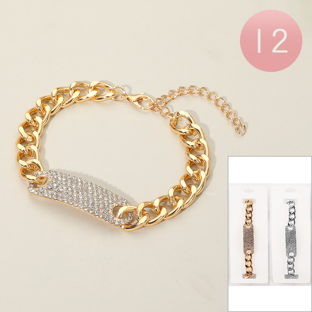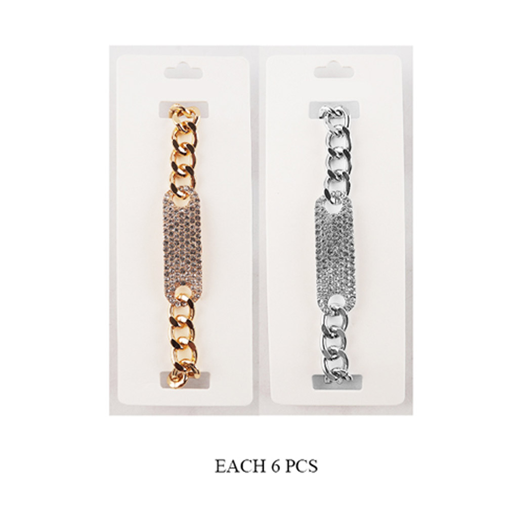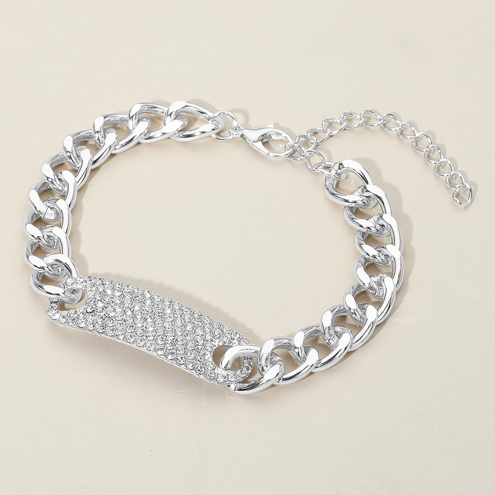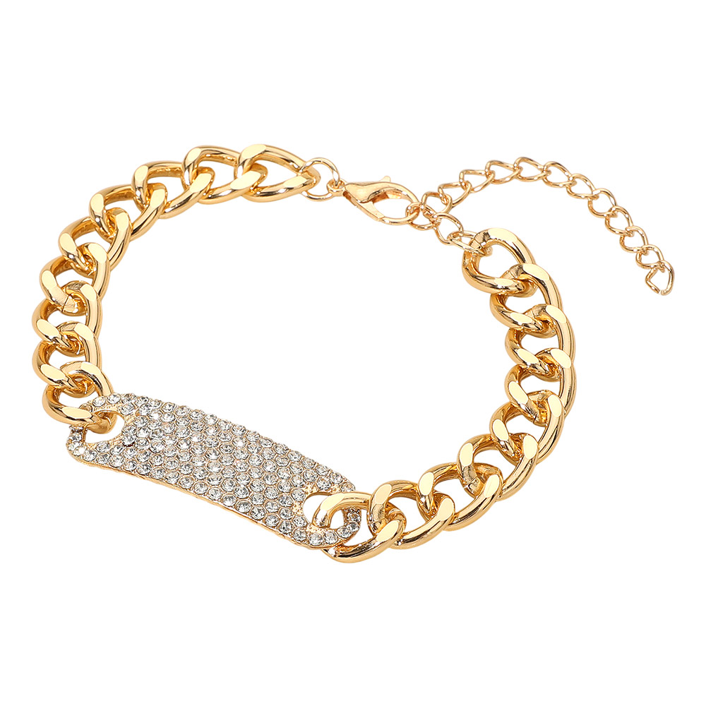 Details • Size : 0.6" H, 9.25" + 3" L • Lobster Clasp Closure • Elevate your look with this Rhinestone Chain Bracelet featuring a bold link design and a shimmering crystal-embellished plate. Perfect for parties, events, or daily wear, this chic accessory adds a touch of glamour and sophistication to any outfit effortlessly. • Lead and Nickel Compliant