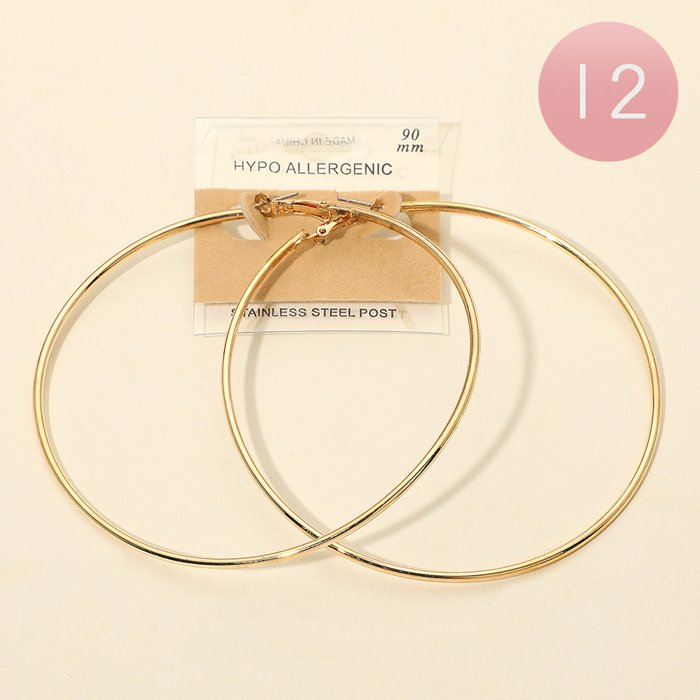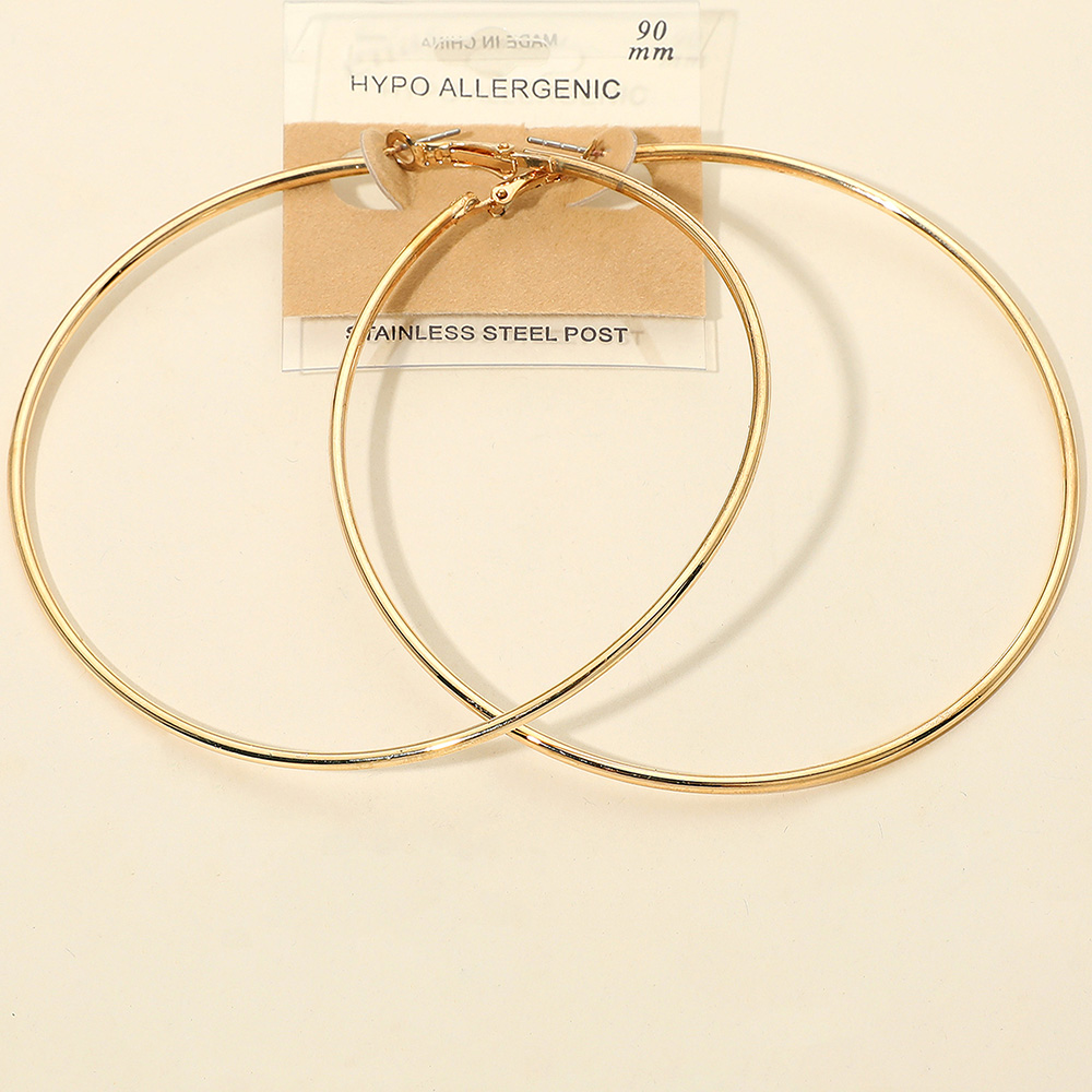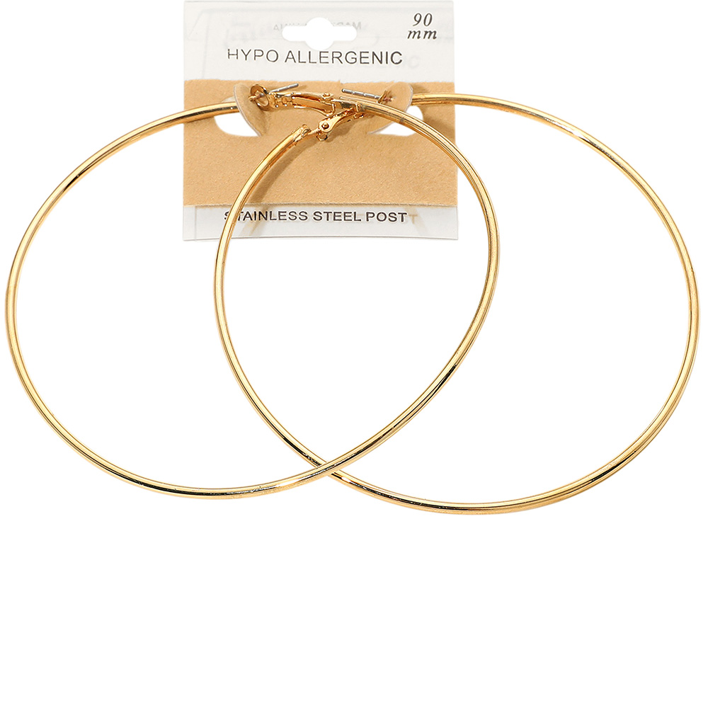 Details • Size : 3.7" X 3.7" • Omega Back • Stand out with these oversized 90mm hoop earrings featuring a sleek polished finish and hypoallergenic stainless steel posts. Lightweight and comfortable, they’re the perfect versatile accessory to enhance any outfit, from everyday wear to special occasions. • Hypoallergenic • Stainless Steel