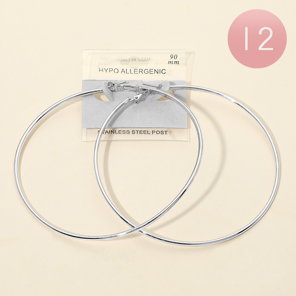 Details • Size : 3.7" X 3.7" • Omega Back • Stand out with these oversized 90mm hoop earrings featuring a sleek polished finish and hypoallergenic stainless steel posts. Lightweight and comfortable, they’re the perfect versatile accessory to enhance any outfit, from everyday wear to special occasions. • Hypoallergenic • Stainless Steel