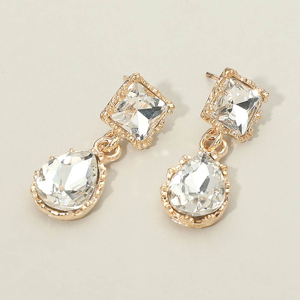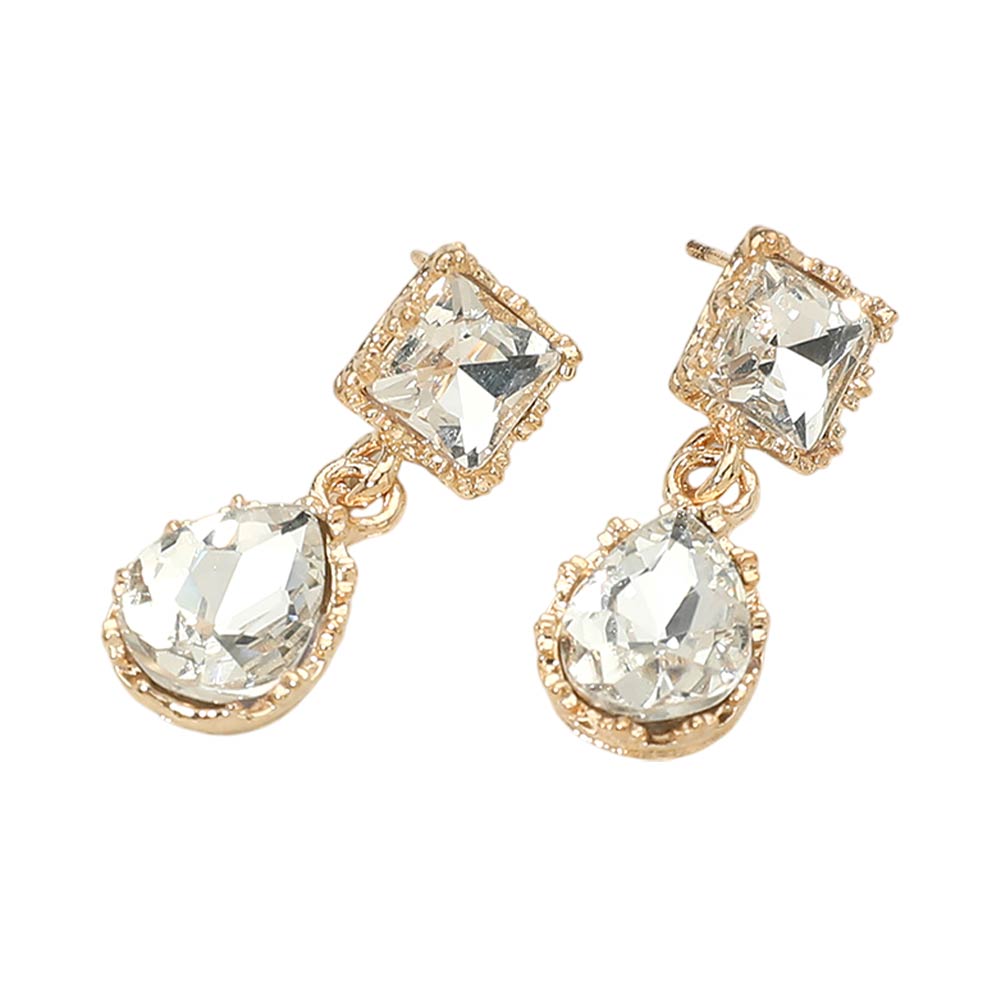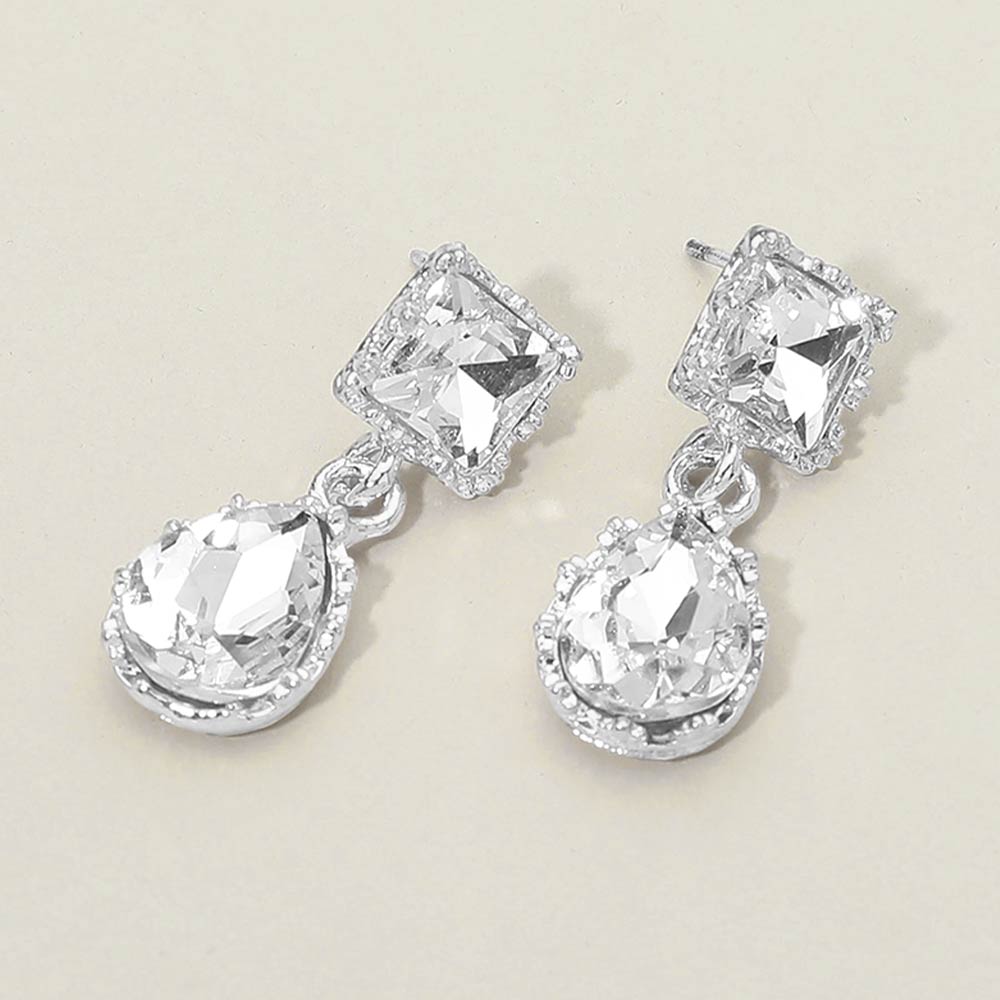 Details • Size : 0.5" X 1.25" • Post Back • Striking drop earrings featuring a geometric square stud paired with a faceted teardrop accent for elegant movement and shine. Designed to feel lightweight and comfortable, they elevate both day and evening looks. Ideal for weddings, formal events, parties, gifting, and statement accessory collections seeking timeless sparkle and refined style.