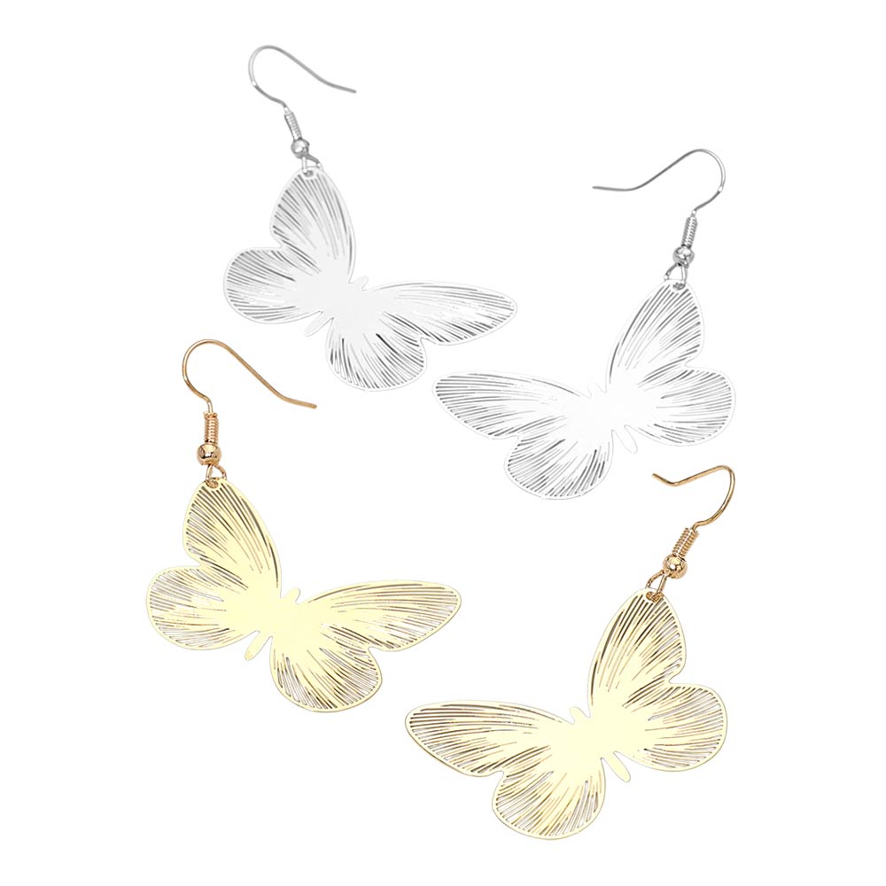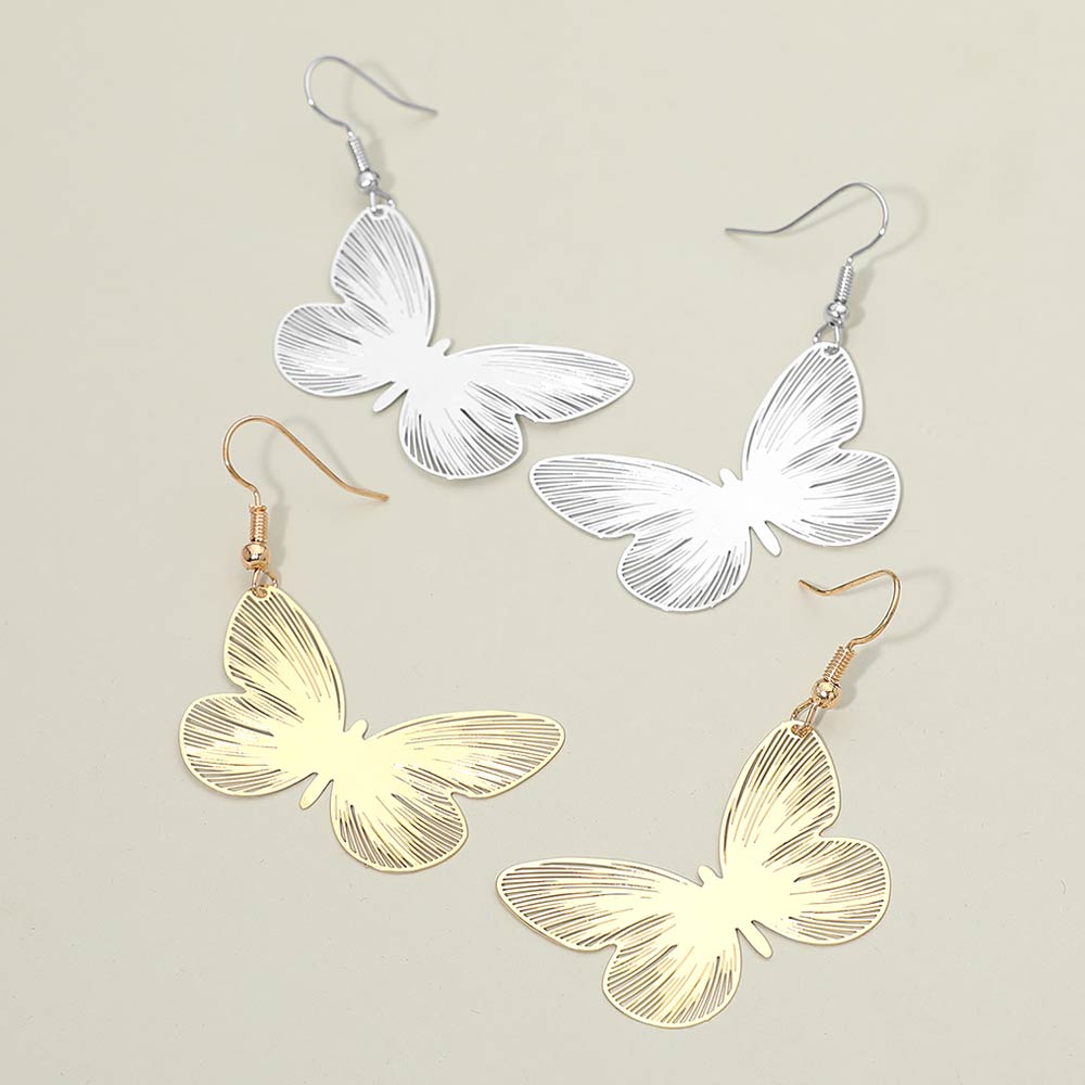 Details • Size : 1.5" X 2.25" • Fish Hook Back • Delicate butterfly drop earrings designed with finely etched wing details for a graceful, lightweight look. Add movement and charm to everyday outfits, vacations, events, and special occasions. Easy to wear and giftable, they bring a feminine, nature-inspired touch to modern accessory collections.