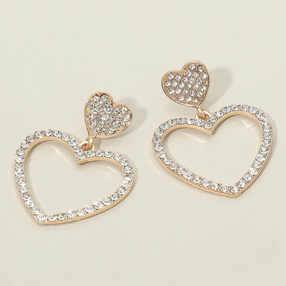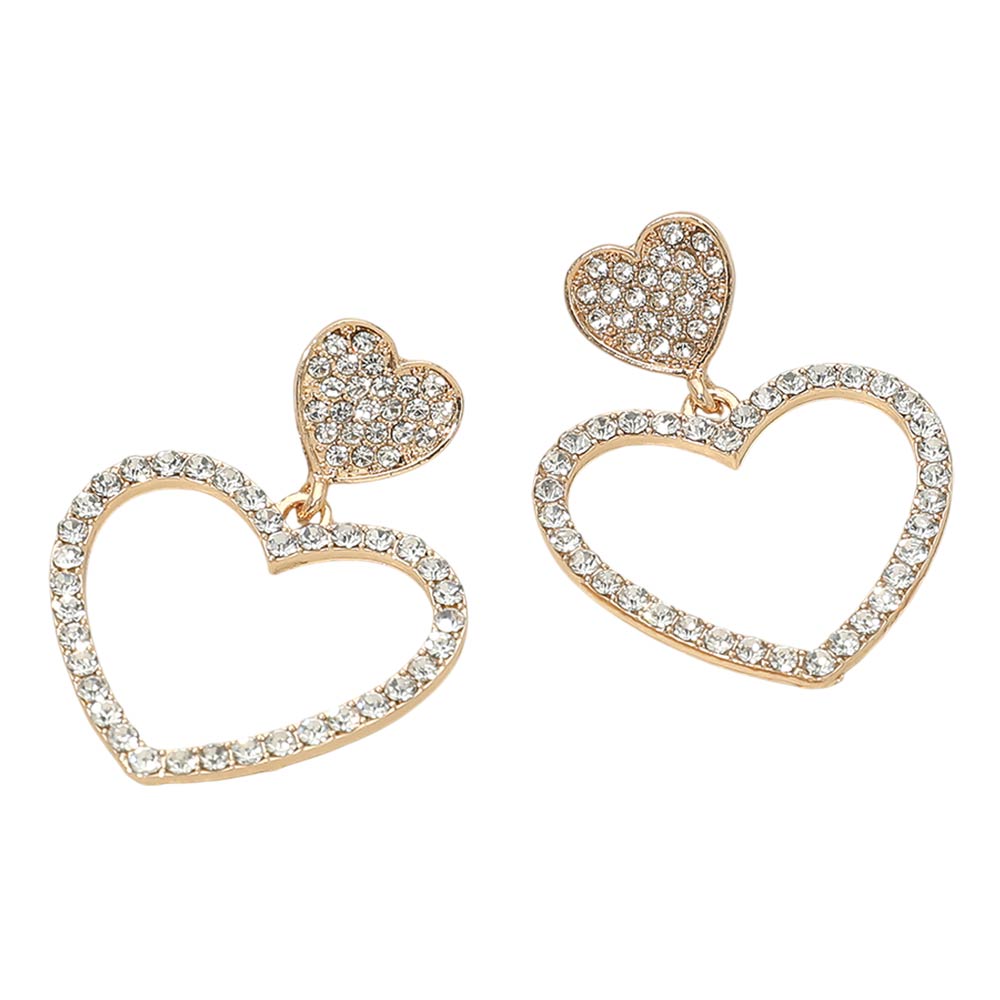 • Romantic drop earrings designed with a layered double heart silhouette featuring a crystal-outlined open heart paired with a pavĂ©-style heart stud. Lightweight with elegant movement, they add sparkle and charm to any look. Perfect for everyday wear, date nights, gifting, parties, and special occasions with timeless, feminine appeal.