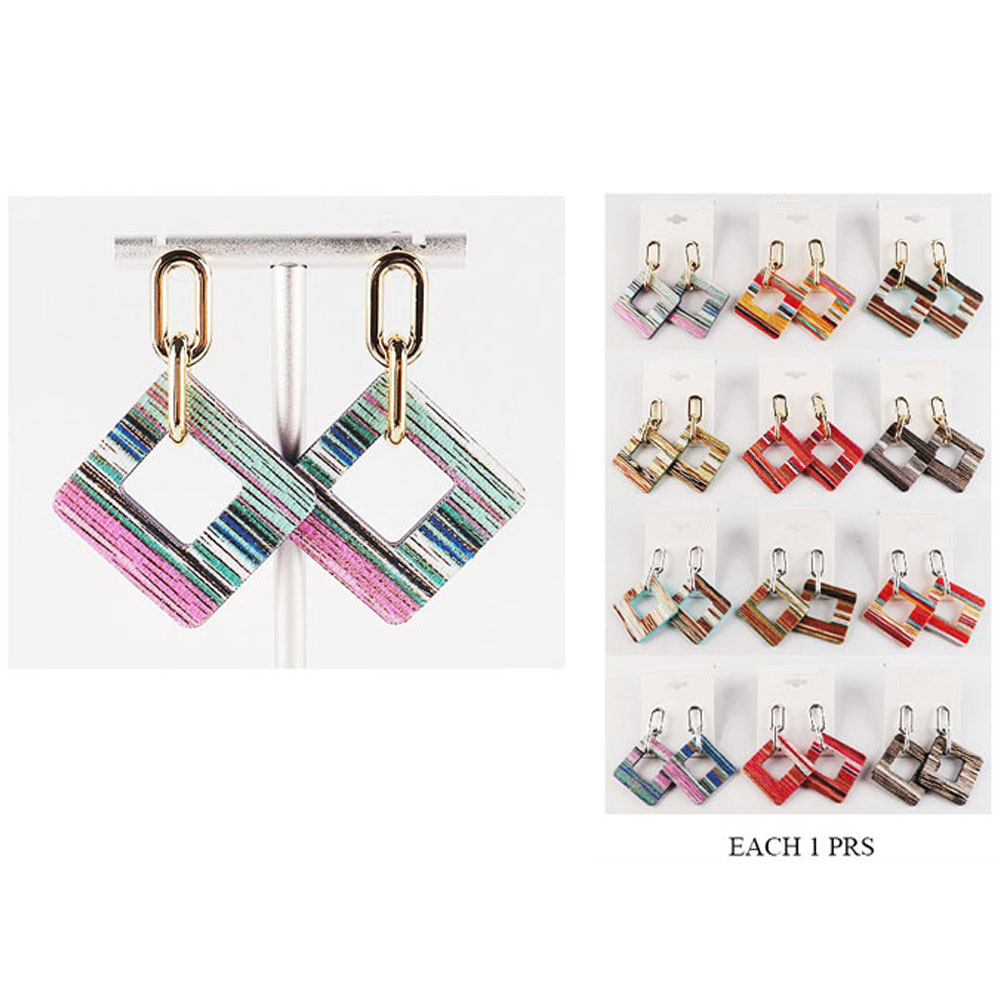 Details • Size : 1.8" X 2.6" • Post Back • These striped square link dangle earrings feature a geometric open-square design paired with bold metallic links. Their artistic striped finish adds a playful yet modern flair, making them a standout accessory for elevating both casual and statement fashion looks effortlessly.
