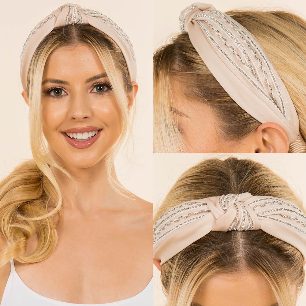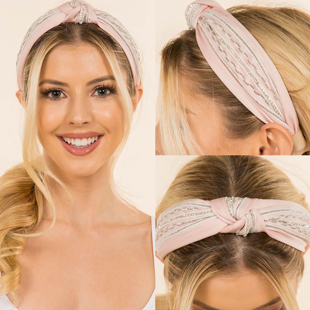 Details • Size : 1.5" H • Statement knot headband designed with sleek striped detailing and subtle rhinestone beads accents for an elevated look. Comfortable wrap style adds polish to everyday outfits, special occasions, or evening wear. Easy to style and wear, making it a versatile hair accessory ideal for gifting and boutique collections.