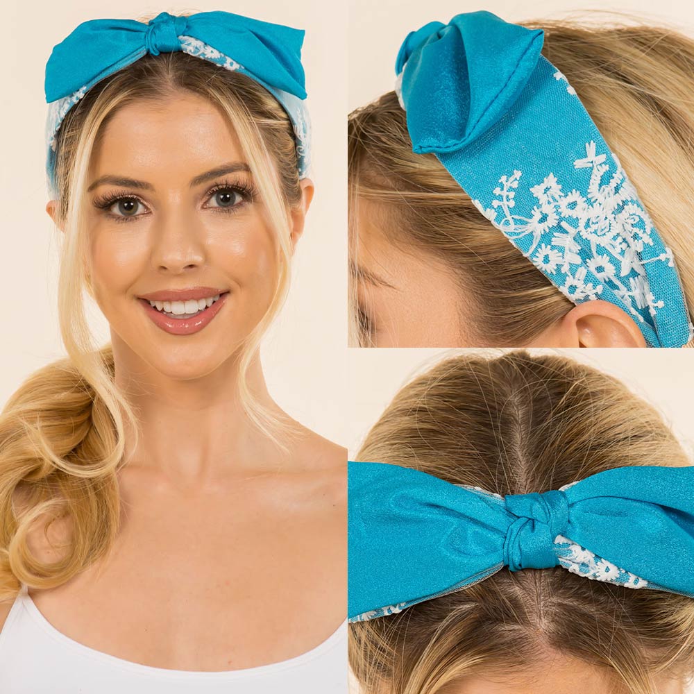 Details • Size : 2.1" H • Embroidered bow knot headband designed with delicate stitched detailing and a soft, comfortable wrap fit. Adds a feminine, polished touch to everyday outfits, travel looks, or special occasions. Easy to style and wear, making it a versatile hair accessory for gifting and boutique collections.
