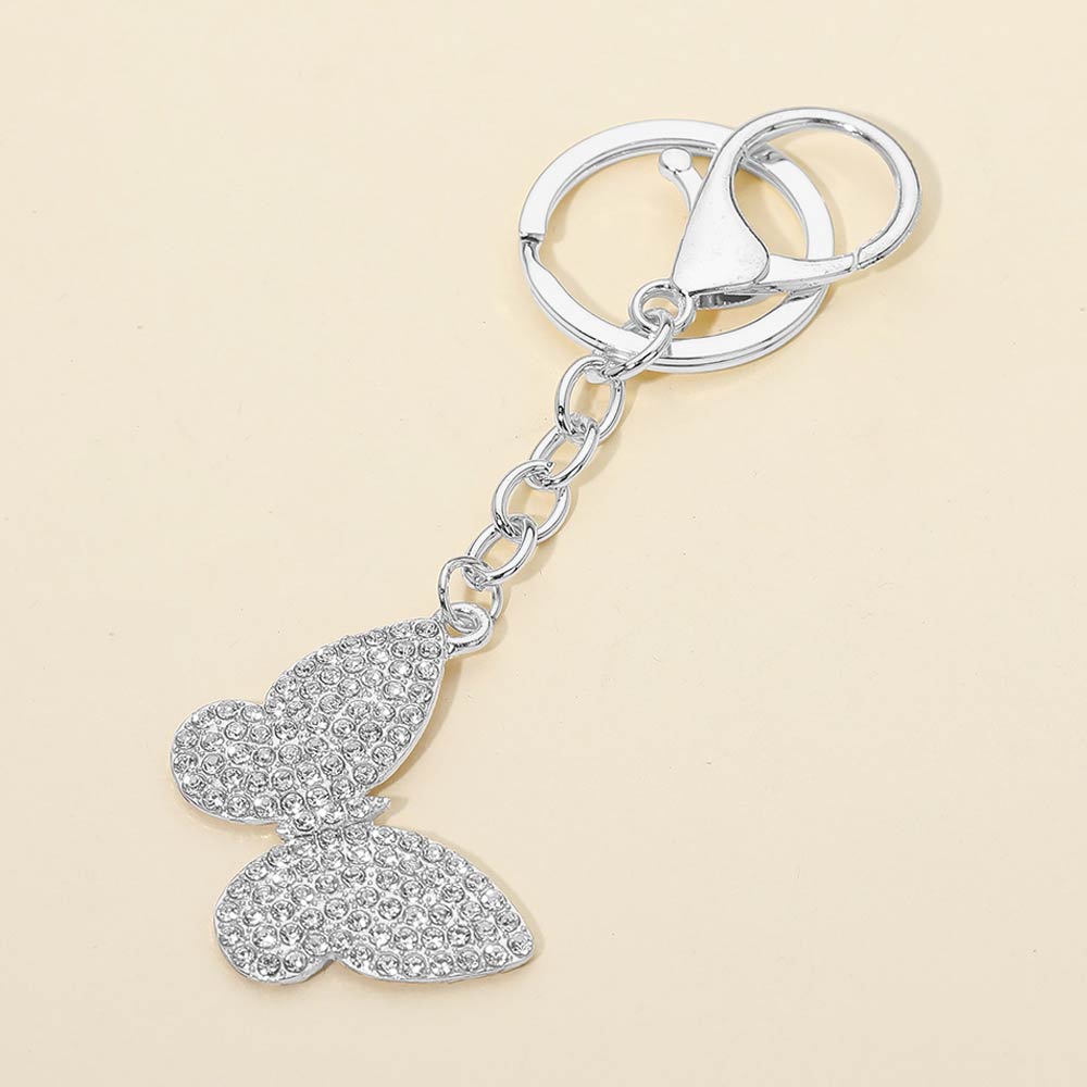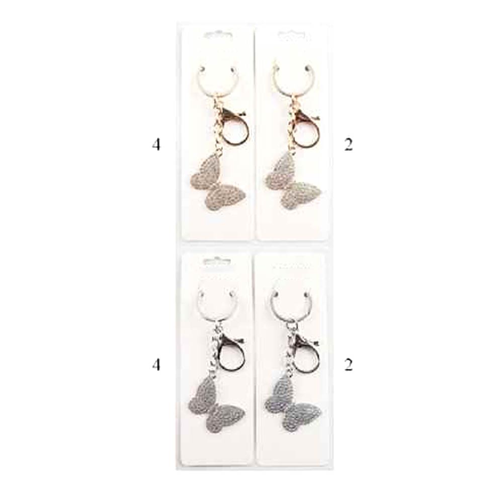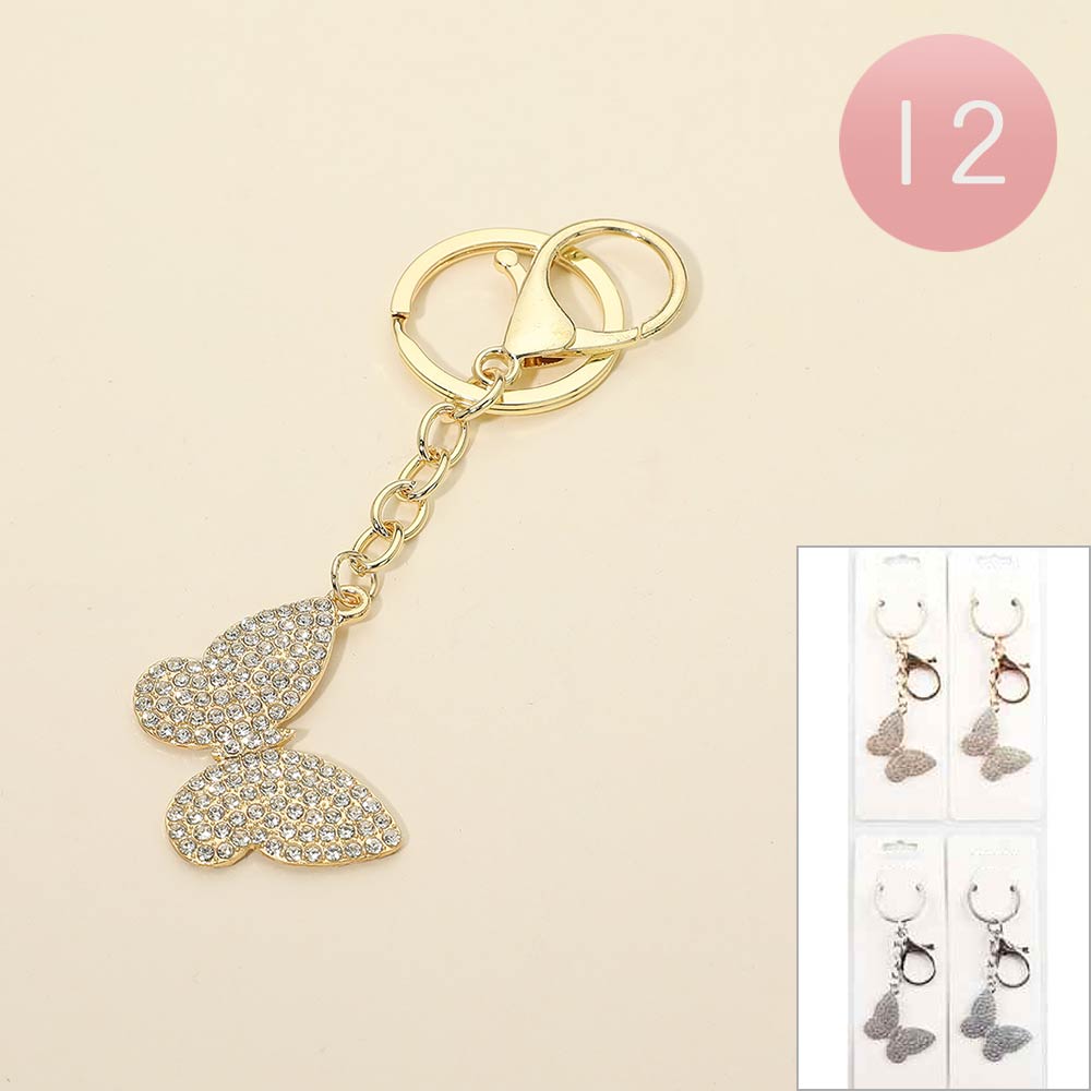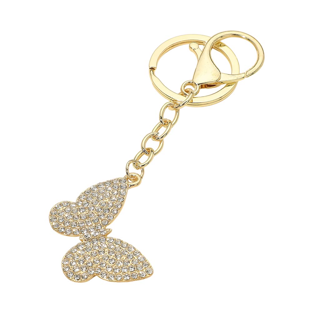 Details • Size : 4" L, 1.6" X 3" • Butterfly charm keychain designed with full rhinestone detailing for eye-catching sparkle and elegant movement. Finished with a secure keyring and lobster clasp for easy attachment to keys, handbags, or totes. A stylish accessory for gifting, boutique displays, and everyday decorative use.
