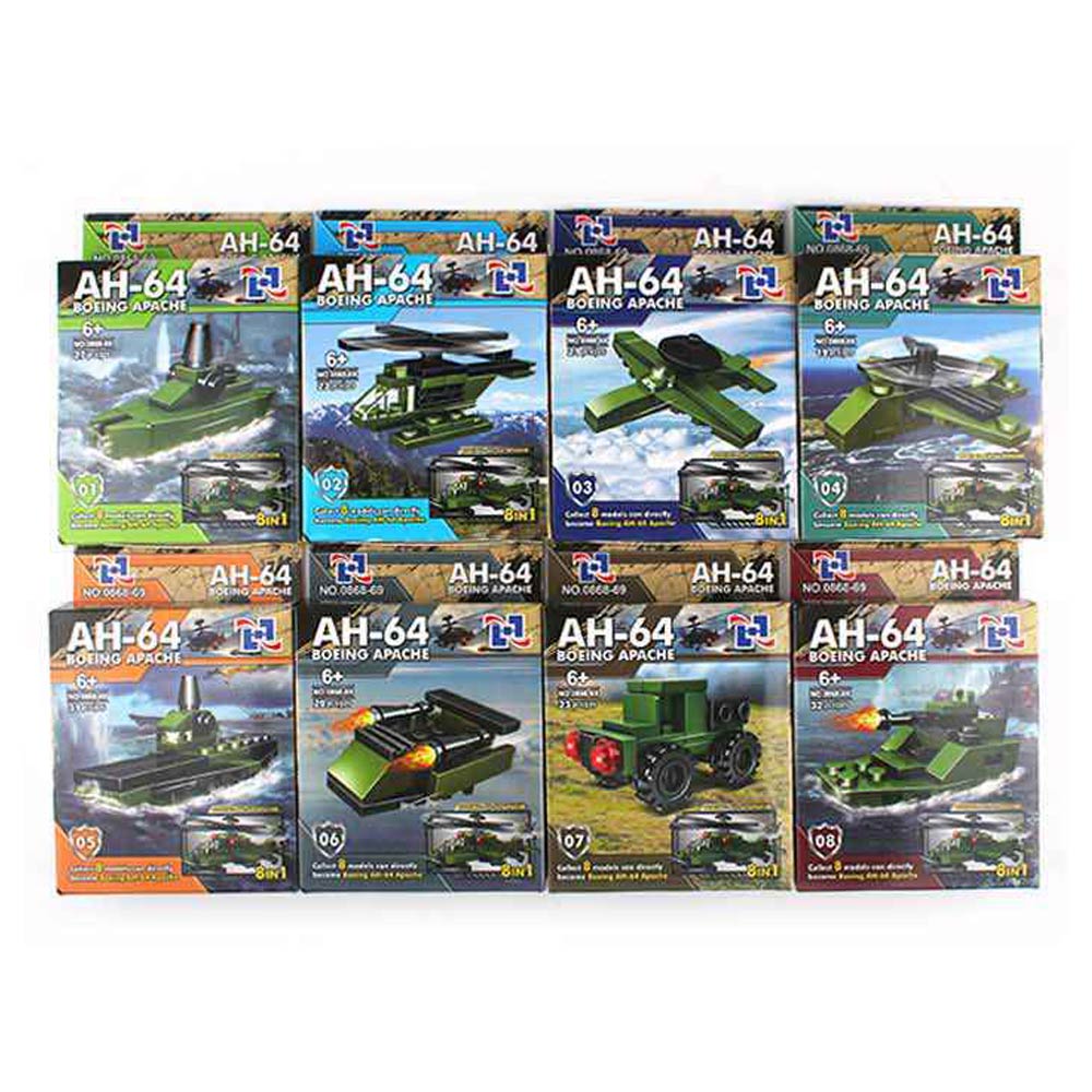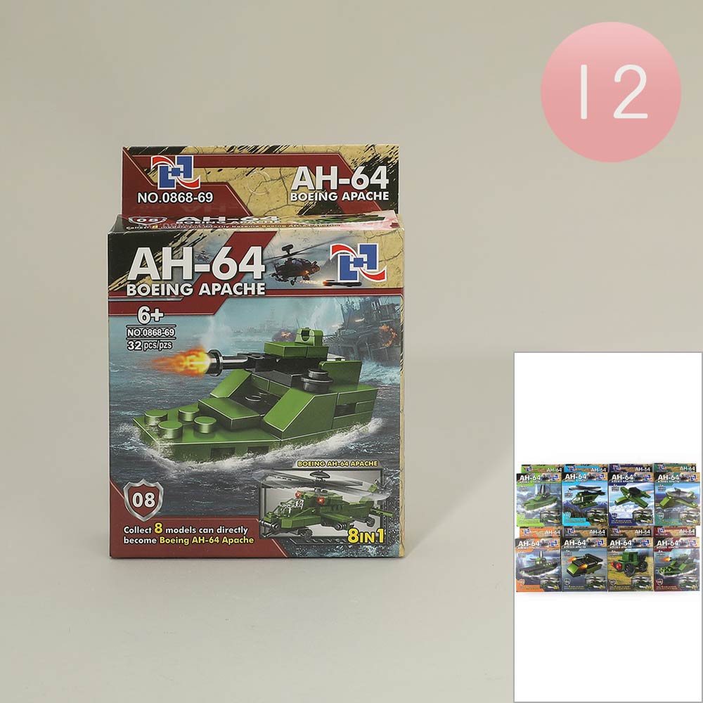 Details • Size : 3.6" X 5.25" • This AH-64 helicopter building block set includes 12 mini construction kits with assorted vehicle designs. Supports creative play, fine motor skills, and problem-solving as kids build, display, and combine models. Great for party favors, gift sets, classroom prizes, and toy assortments.
