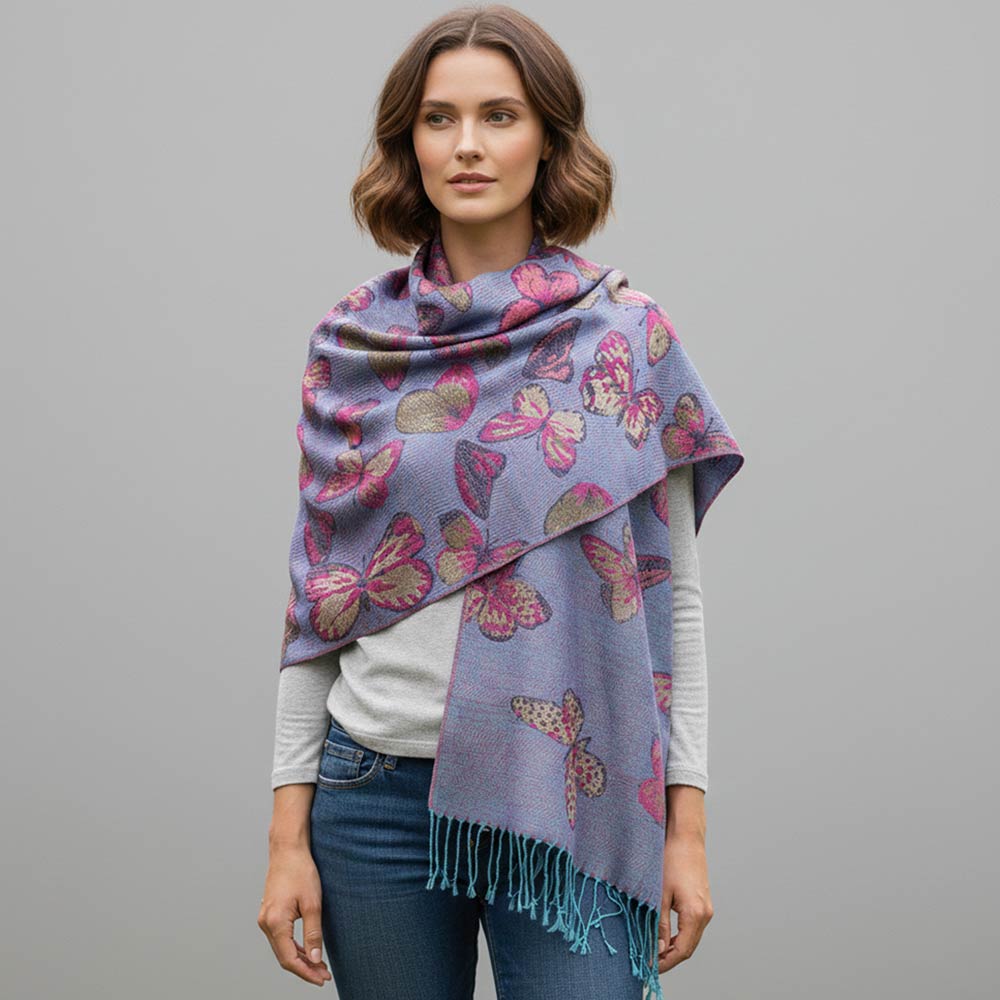 Details • Size : 27.5" X 76" • Fringe Size : 3.3" L • This butterfly pattern fashion wrap scarf features an elegant allover motif with soft fringe detailing for graceful drape and versatile styling. Ideal for layering with casual or dressy outfits, it works well for seasonal assortments, boutique collections, and gift-ready accessory displays.