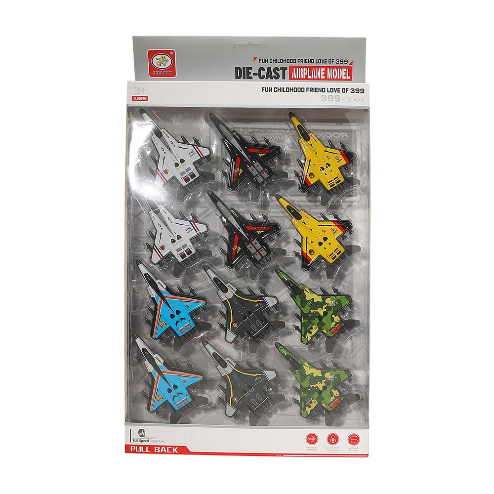 Details • Size : 2.5" X 3.75" • Fuel imaginative play with this die-cast pull-back airplane toy set featuring multiple detailed jet designs. Simply pull back and release to watch them zoom forward. Perfect for display or action play, this compact set delivers fun at home, parties, or on the go.