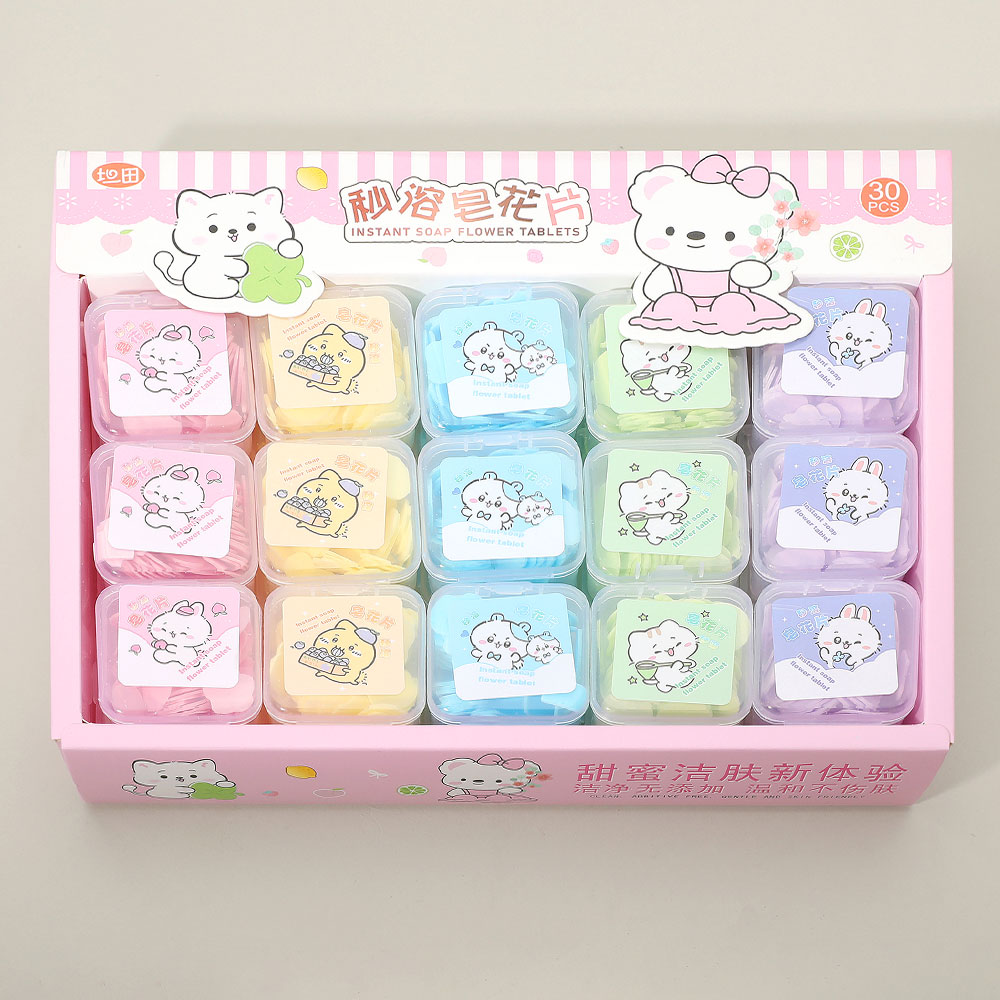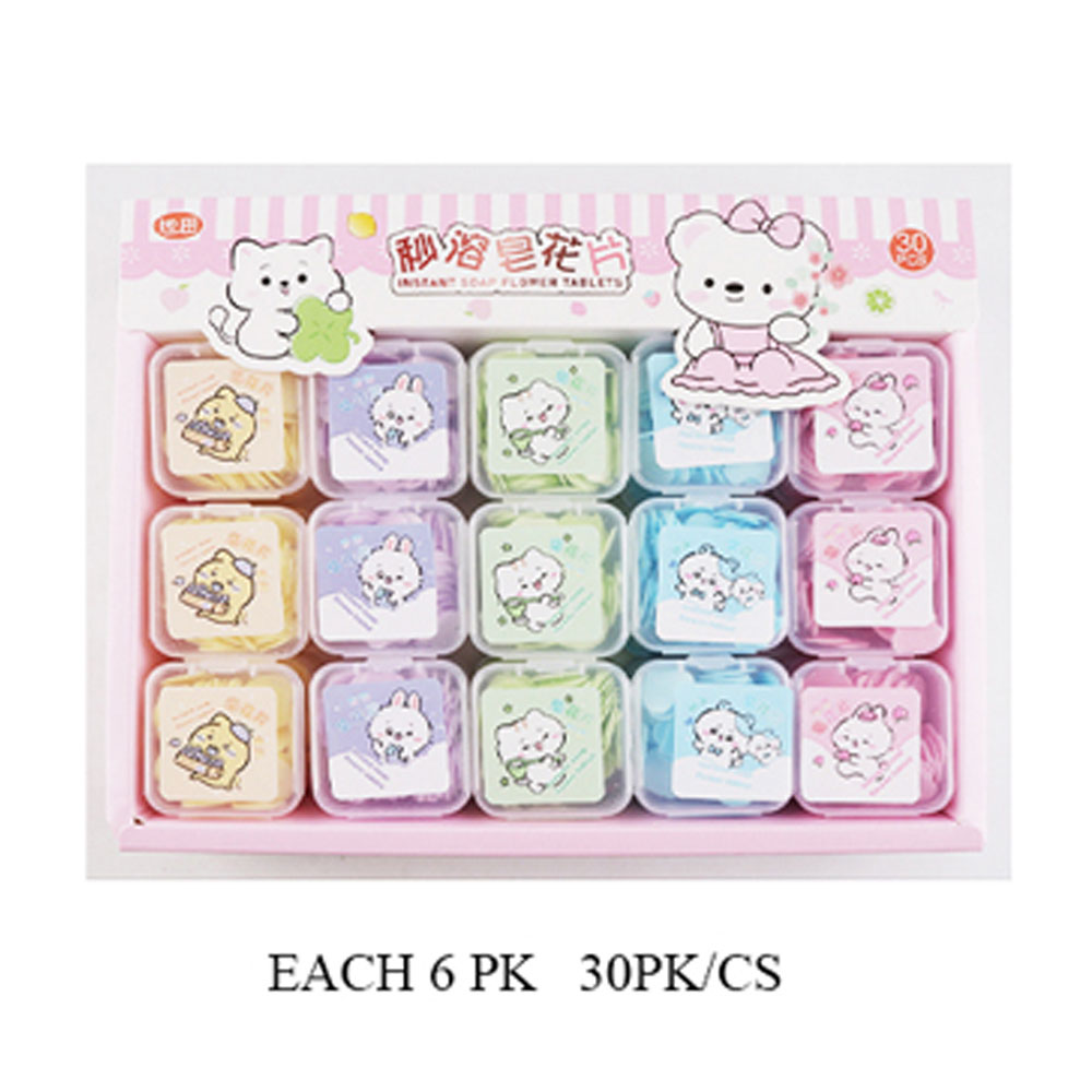 Details • Siez : 1.75" X 1.75" X 0.75" • Set of 30 instant soap flower tablets in adorable animal cases. Each box features single-use soap petals for easy handwashing at home or on the go. Perfect for travel, gifts, or kids’ hygiene kits—compact, convenient, and delightfully designed for everyday freshness.