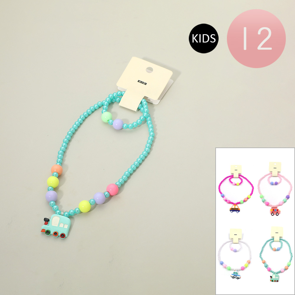 Details • Necklace Size : 9" L / Stretchable • Pendant Size : 1.1" L • Bracelet Size : 0.5" H / Stretchable • Charming kids’ jewelry set featuring a playful vehicle charm on a beaded necklace and matching bracelet. This 12-piece pack is ideal for party favors, birthday surprises, or everyday fun, making it a delightful accessory choice for children who love creative and themed jewelry.