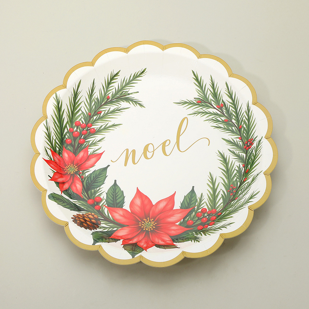 Details • Size : 10" X 10" • Serve your holiday treats in style with these Noel paper plates featuring a festive wreath and poinsettia design. With scalloped edges and elegant details, perfect for Christmas parties, gatherings, and seasonal entertaining.