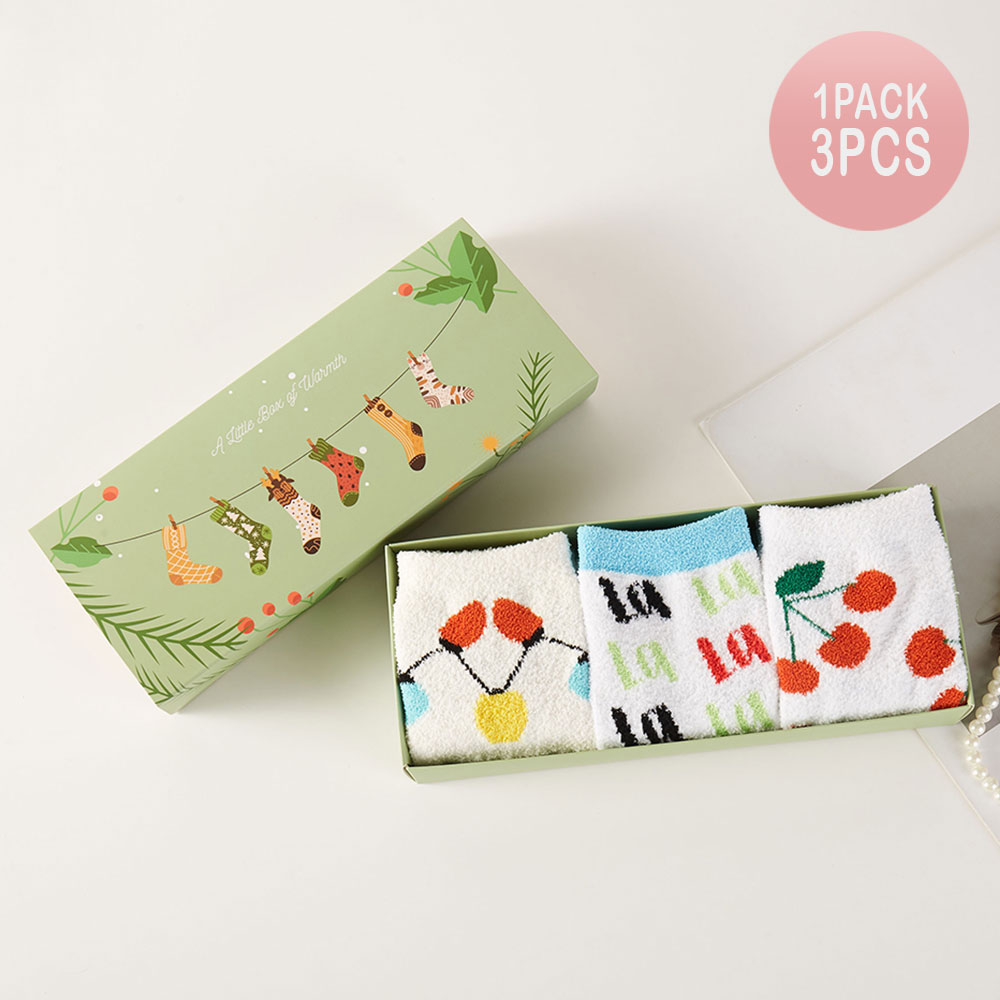 Details • Size : 9 - 11 • Material : 100% Polyester • Add playful charm to your wardrobe with this 3-pair cozy socks gift set featuring cherries, festive lights, and bold “LOL” text designs. Packaged in a decorative box, perfect for gifting or treating yourself to daily comfort and fun.