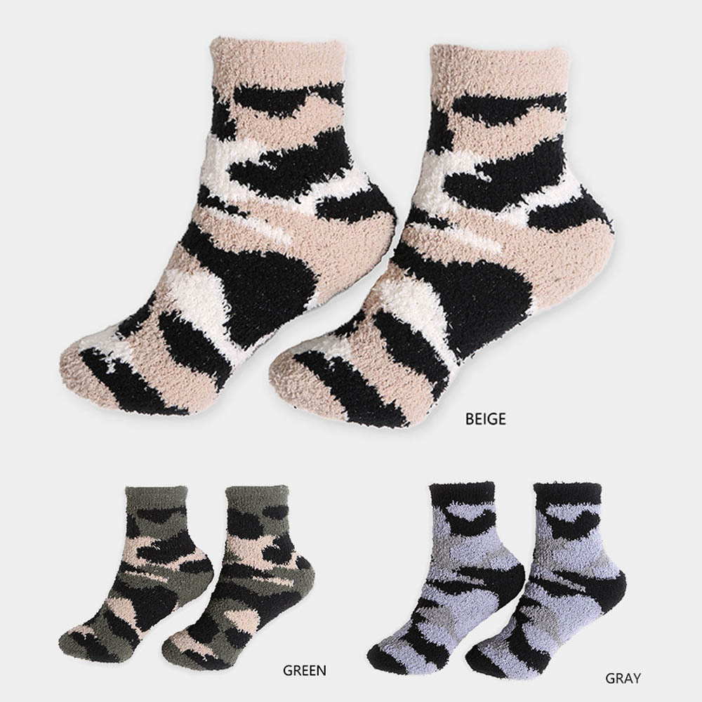 • Warm and cozy fuzzy socks set with fun camouflage print designs. Perfect for lounging, relaxing, or gifting, these soft socks offer plush comfort and stretch for a snug fit. Ideal for keeping feet warm during colder days while adding a stylish touch to indoor wear.