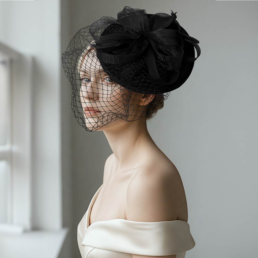 Details • Size : 11" X 10.5" • Dual : Hair Pinch Clip / Headband • Statement fascinator headpiece featuring a sculpted floral accent with delicate face veil detail. Designed to elevate formal outfits, this eye-catching accessory is ideal for weddings, bridal events, race day looks, and special occasions where refined style and standout elegance matter.