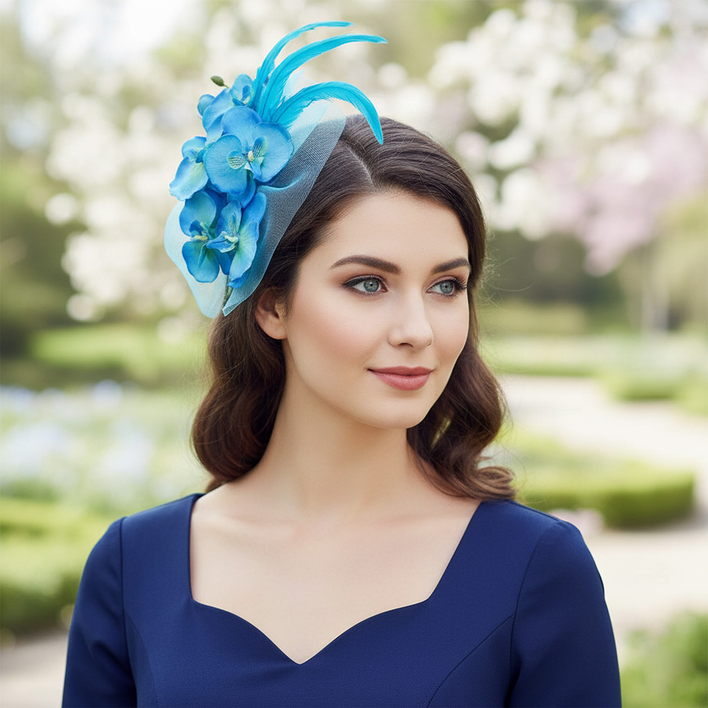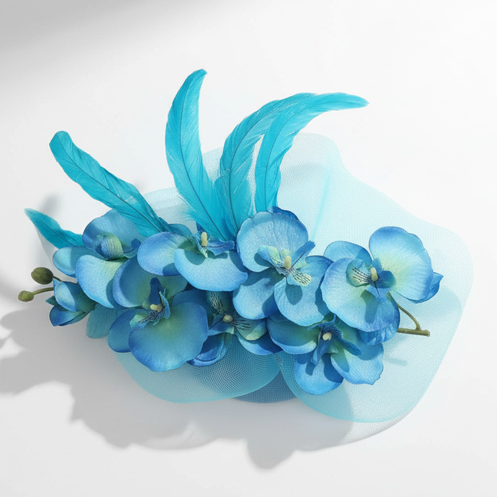 • Elegant fascinator headpiece featuring floral detailing and feather accents, perfect for weddings, garden parties, or race day events. Designed to sit gracefully, this accessory adds a refined touch to dressy outfits with elegance and charm.