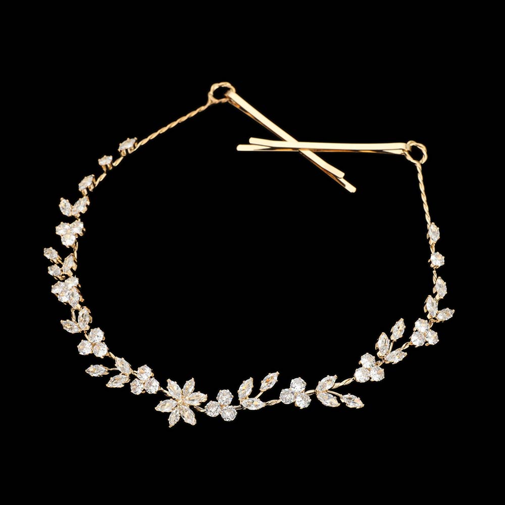 Details • Size : 15" X 0.6" • A Pair Bobby Pin and Sash Ribbon Included • Elegant leaf-style hair vine designed to frame bun and updo hairstyles with sparkling crystal accents. Perfect for weddings, bridal looks, proms, and formal events. Lightweight and flexible for secure styling, adding a graceful and romantic finishing touch to special occasion hair. • CZ Cubic Zirconia