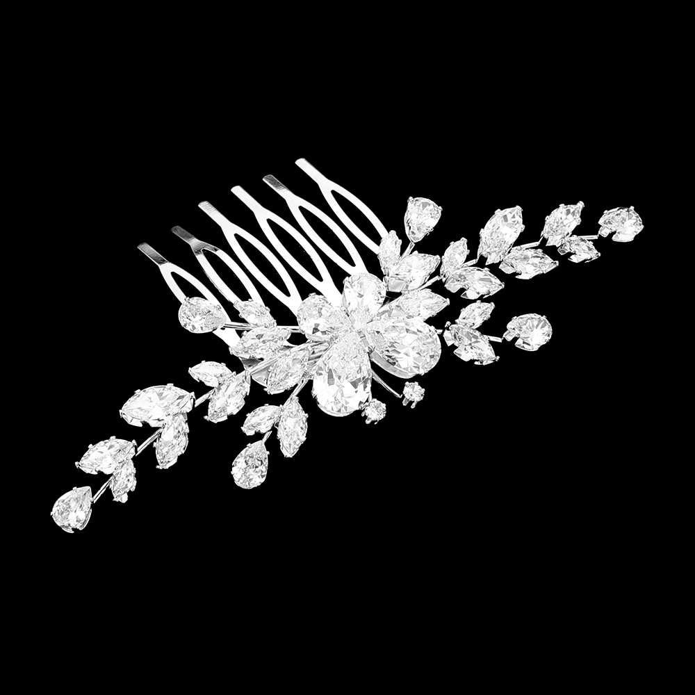 Details • Size : 4" X 1.2" • Elevate any bridal or formal hairstyle with this crystal floral hair comb adorned with eye-catching leaf and flower accents. Its secure comb base slips easily into updos, offering a radiant, elegant touch perfect for weddings, proms, and special events. • CZ Cubic Zirconia • Lead and Nickel Compliant