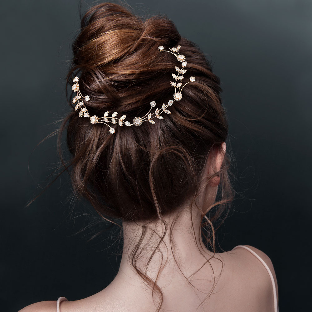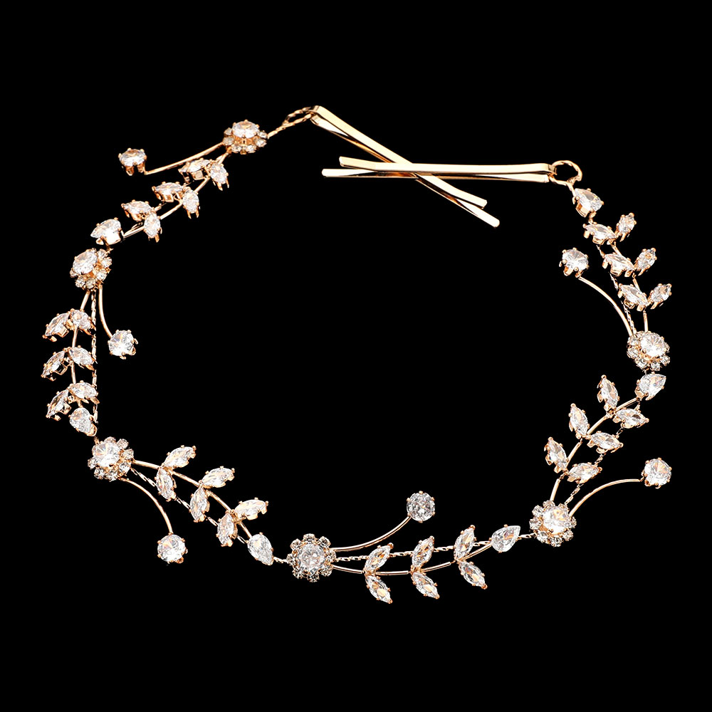 Details • Size : 11" X 0.8" • A Pair Bobbi Pin Included • This bridal hair vine showcases crystal blossoms and marquise cz stones arranged in graceful branches along a flexible band. It molds effortlessly to updos or half-up styles, adding refined sparkle and a nature-inspired elegance to wedding and special-occasion hairstyles. • CZ Cubic Zirconia • Lead and Nickel Compliant