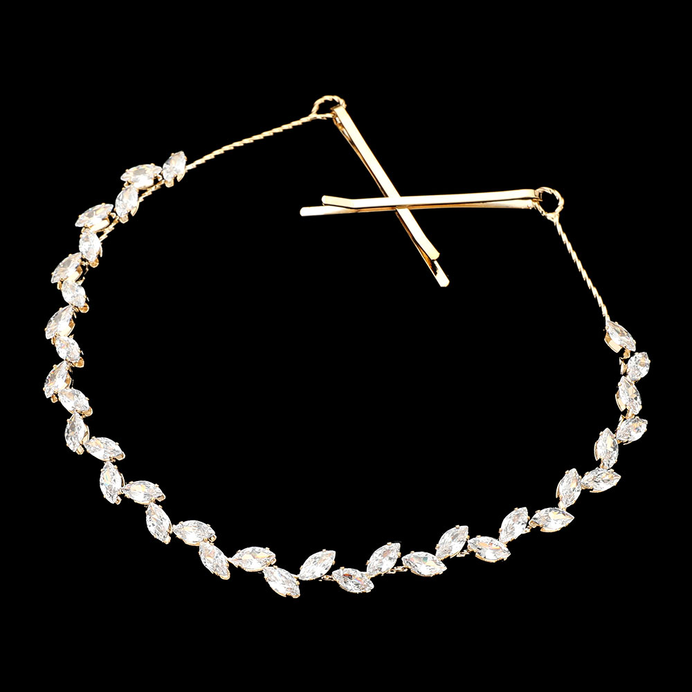 Details • Size : 11" X 0.3" • A Pair Bobbi Pin Included • This bridal crystal leaf hair vine brings refined sparkle to any wedding hairstyle. Featuring marquise-cut cz stones in a graceful vine pattern, it bends easily for customized placement around updos or braids, creating a timeless and elegant finishing touch for special occasions. • CZ Cubic Zirconia • Lead and Nickel Compliant