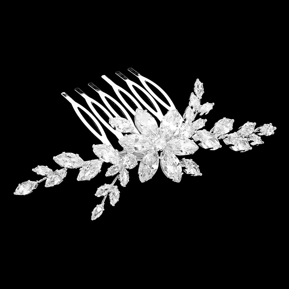 Details • Size : 4" X 1.25" • Sparkling crystal flower bridal hair comb with elegant leaf accents, designed to add glamour and sophistication to wedding hairstyles. Perfect for brides and special occasions, creating a radiant finishing touch. • CZ Cubic Zirconia