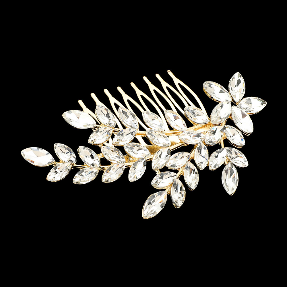 Details • Size : 3.75" X 1.75" • Add a touch of nature-inspired beauty with this elegant crystal leaf hair comb. Featuring marquise-cut stones arranged in a graceful branch design, it sparkles effortlessly in any hairstyle. Perfect for weddings, parties, or special occasions, it enhances your look with refined elegance. • Lead and Nickel Compliant