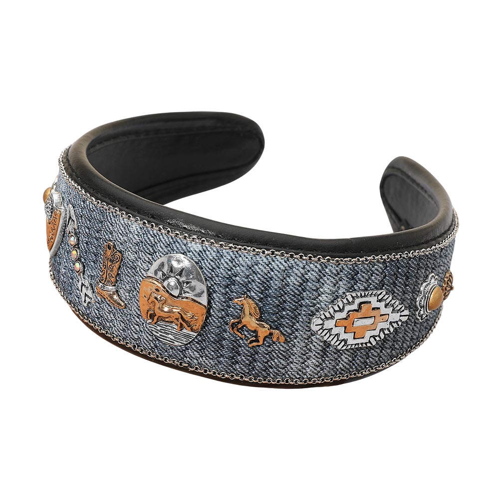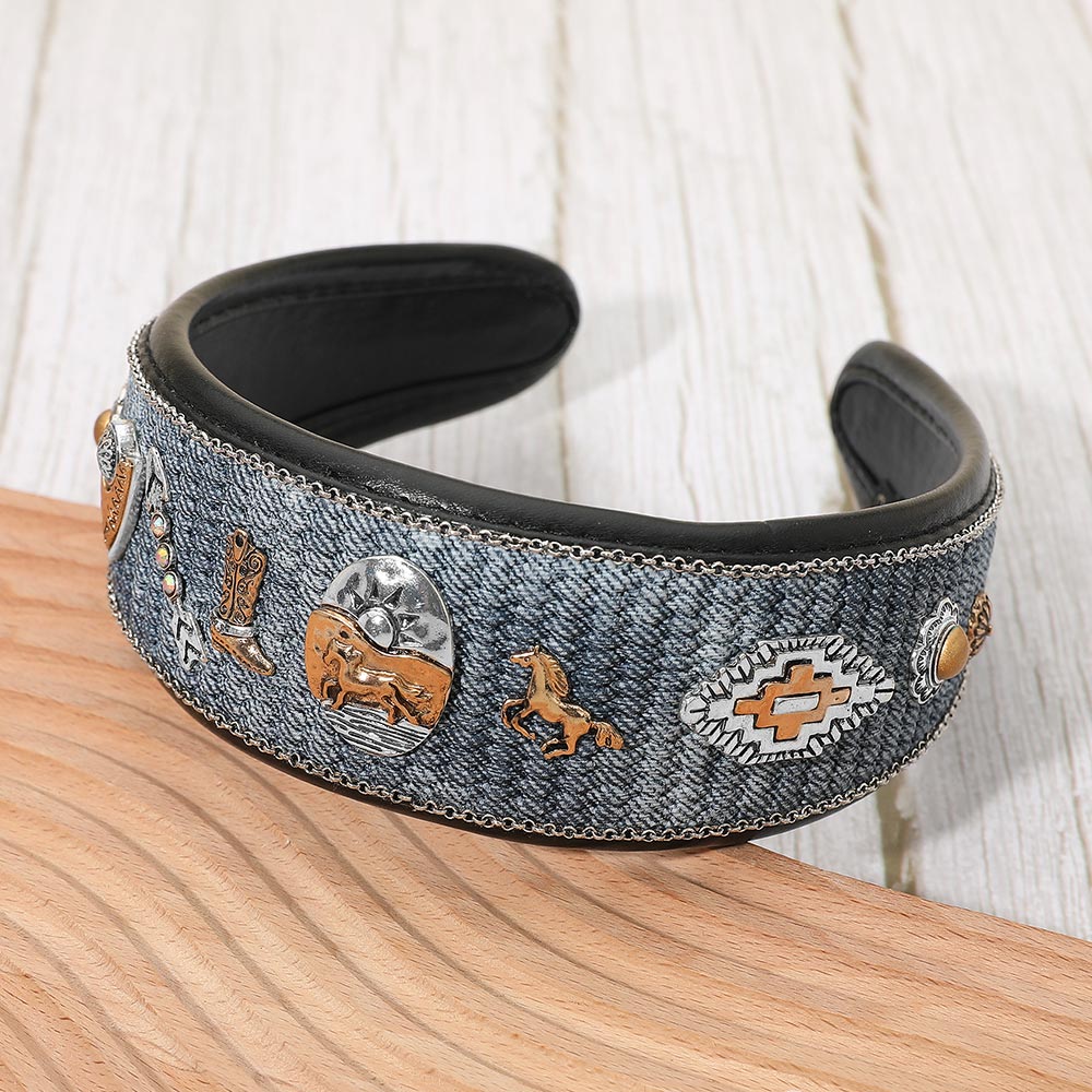 Details • Size : 2" H • Bold denim-style headband featuring cowboy boot, horse, and concho embellishments in silver and bronze tones. The intricate western motifs and chain trim deliver a rugged yet fashionable look, perfect for rodeo events, festivals, or casual boho-inspired outfits.