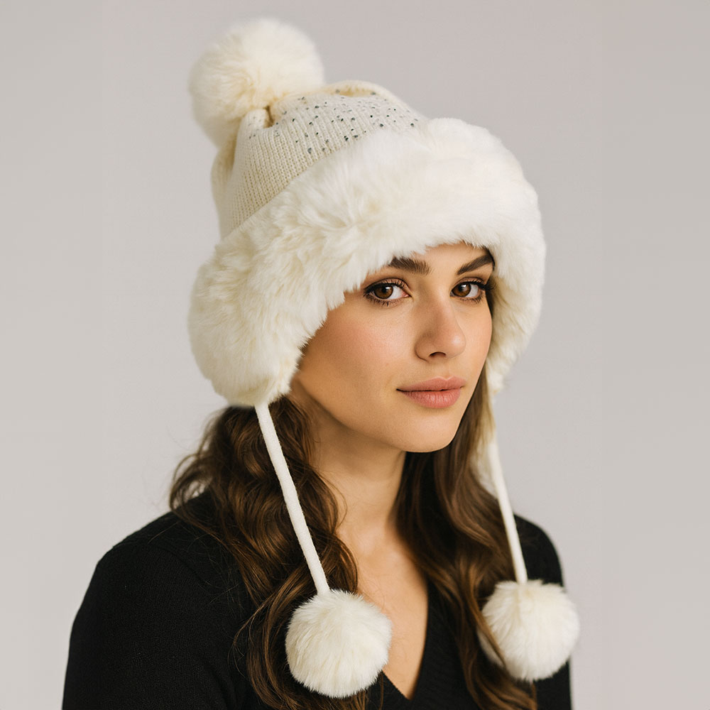 • Add sparkle to your cold-weather style with this winter trapper hat featuring rhinestone accents, plush ear flaps, and playful pom-poms. Designed for warmth and elegance, it’s perfect for outdoor wear, travel, or casual outings, blending cozy protection with chic, eye-catching details.