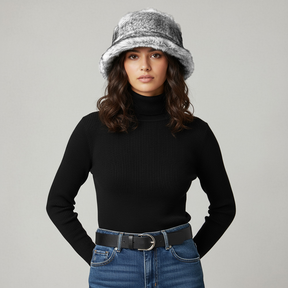 • Cozy bucket hat featuring a soft faux fur plush design, perfect for adding warmth and style to cold-weather outfits. This chic winter accessory offers a trendy and comfortable fit, ideal for both casual wear and fashion-forward looks.