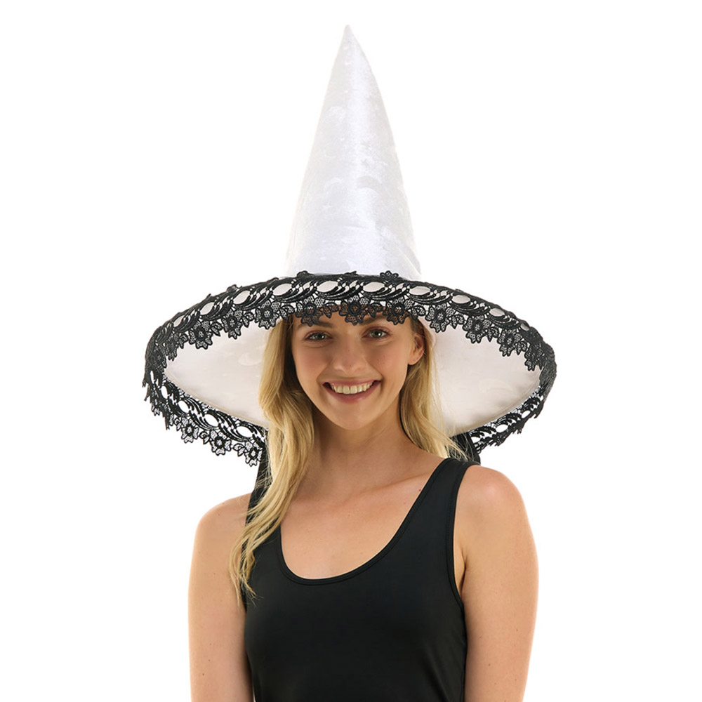 • Pointed witch hat with ornate lace trim around the brim, ideal for Halloween costumes, fantasy events, or cosplay. Adds a sophisticated and enchanting touch to any magical ensemble.