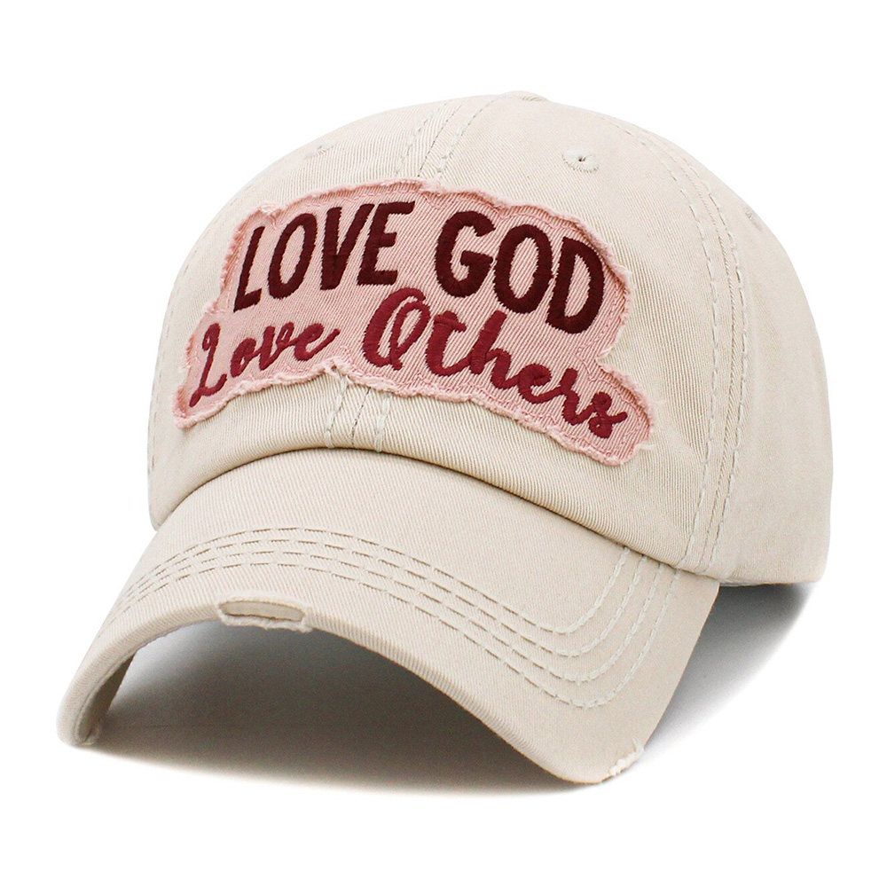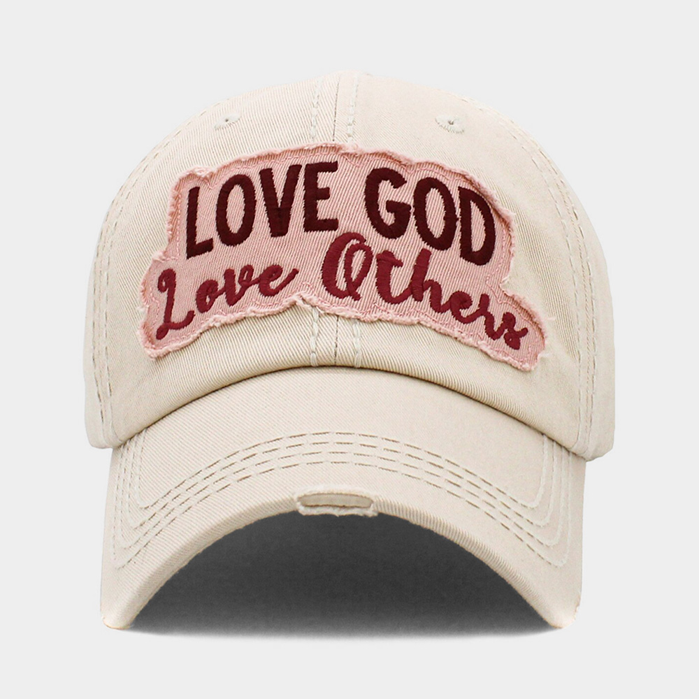 Details • Crown Circumference : 23" (Adjustable) • Crown Height : 4.5" • Brim Height : 3" • Material : 100% Cotton • Show faith and kindness with this distressed baseball cap featuring the inspirational phrase “Love God Love Others.” Stylish with contrast stitching and a comfortable fit, it’s the perfect everyday accessory to spread positivity and encouragement.