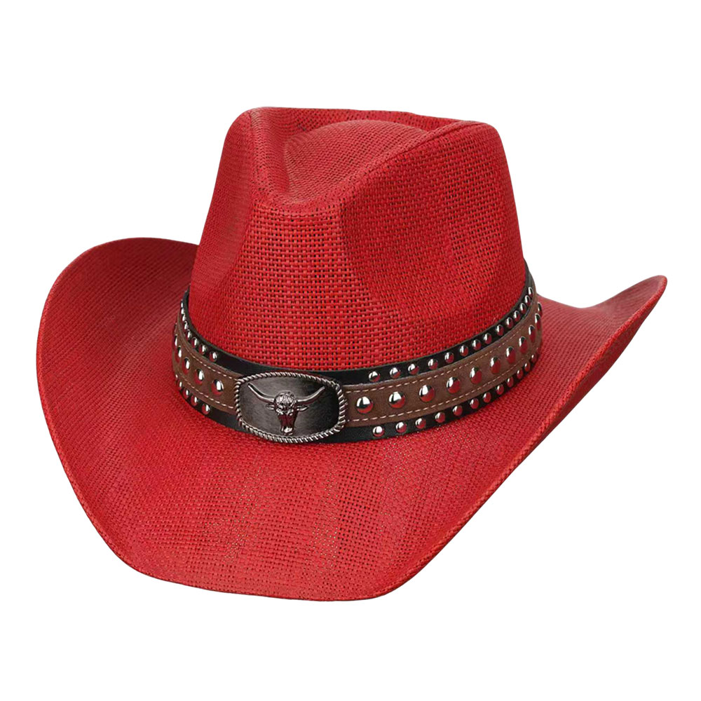 Details • Crown Circumference: 23" • Crown Height : 5.5" • Brim Width : 3.5" • Material : 100% Straw • Bold western-inspired cowboy hat featuring a structured silhouette and a stud-accented band with oval steer head buckle detail. Designed to elevate festival looks, themed collections, and statement outfits, this hat adds rugged character and standout style to any accessory assortment.