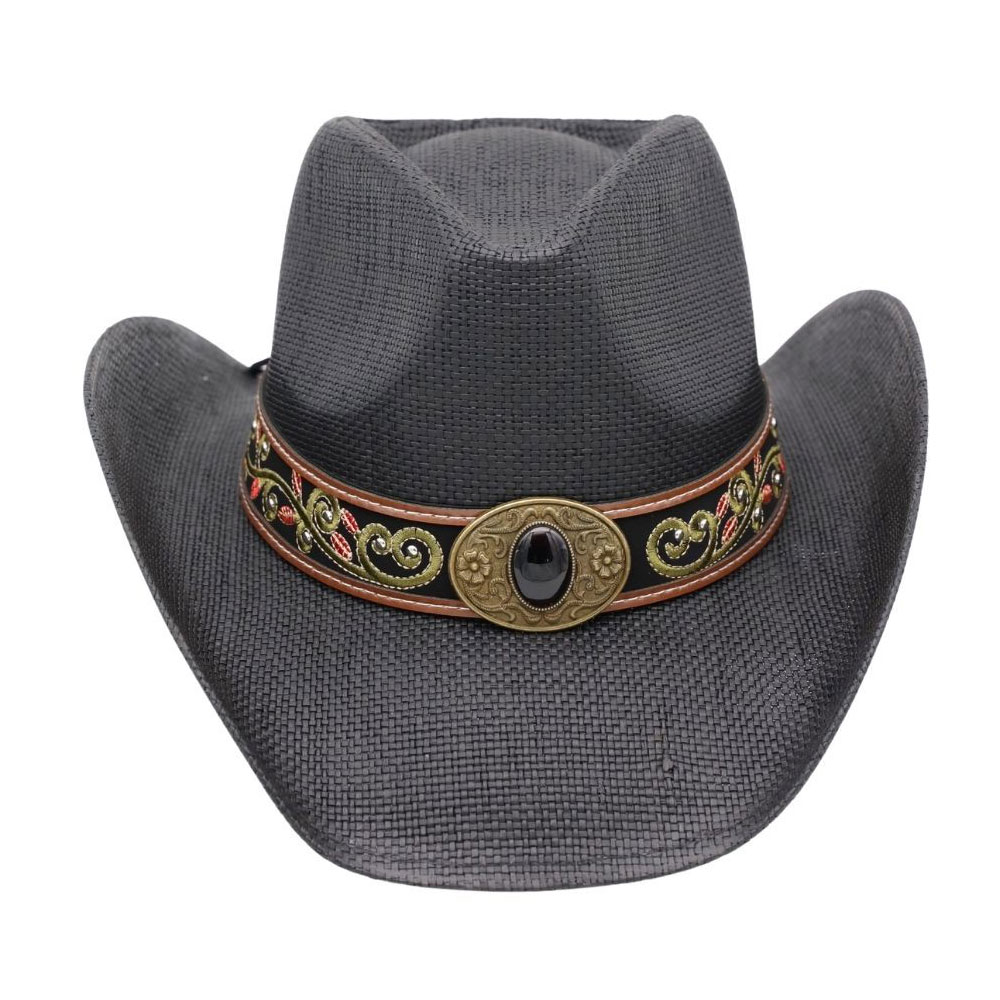 Boho Oval Stone Accent Ornate Faux Leather Band Distressed Straw Western Cowboy Hat
