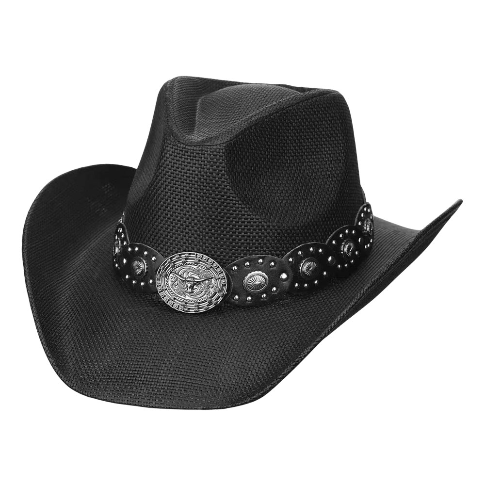 Details • Crown Circumference: 23" • Crown Height : 5.5" • Brim Width : 3.5" • Material : 100% Straw • Bold western cowboy hat featuring a structured crown, curved brim, and an ornate medallion band with decorative stud detailing. Designed for western fashion collections, rodeo styling, festivals, and themed outfits, this statement hat adds authentic western character and standout appeal.