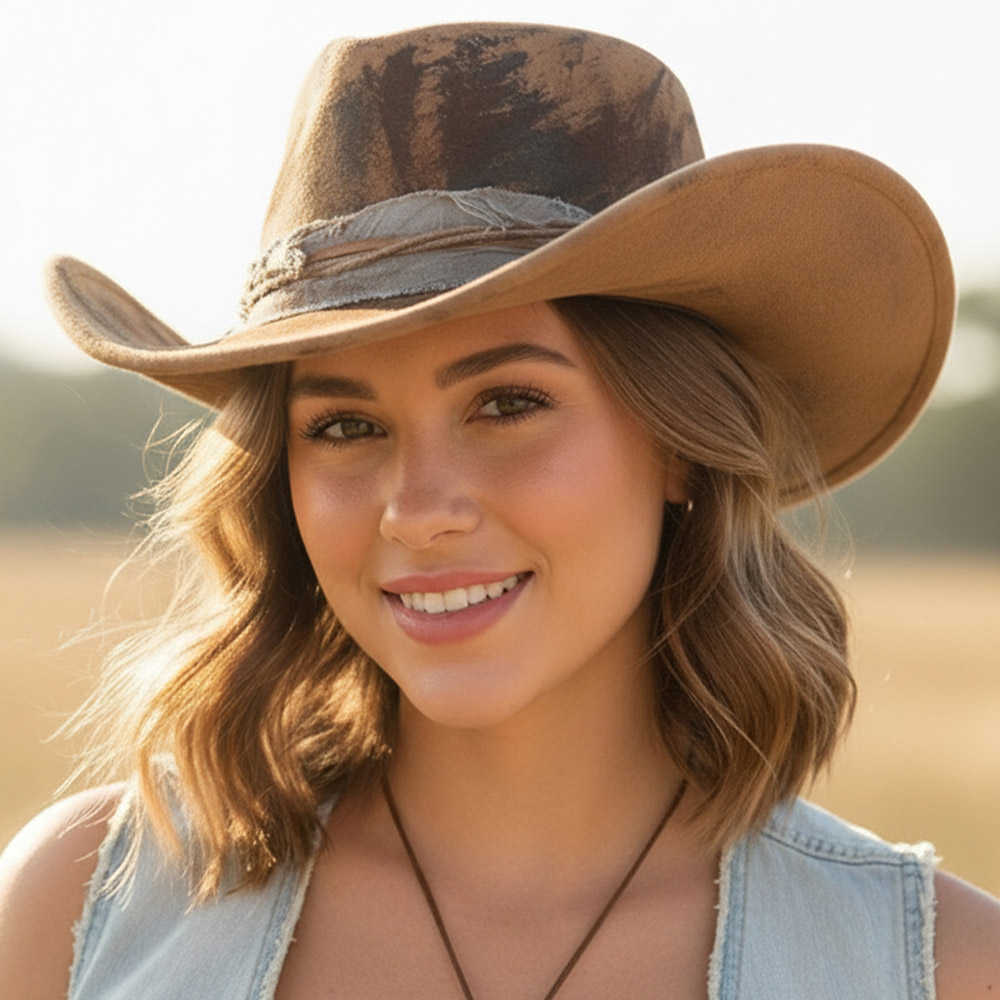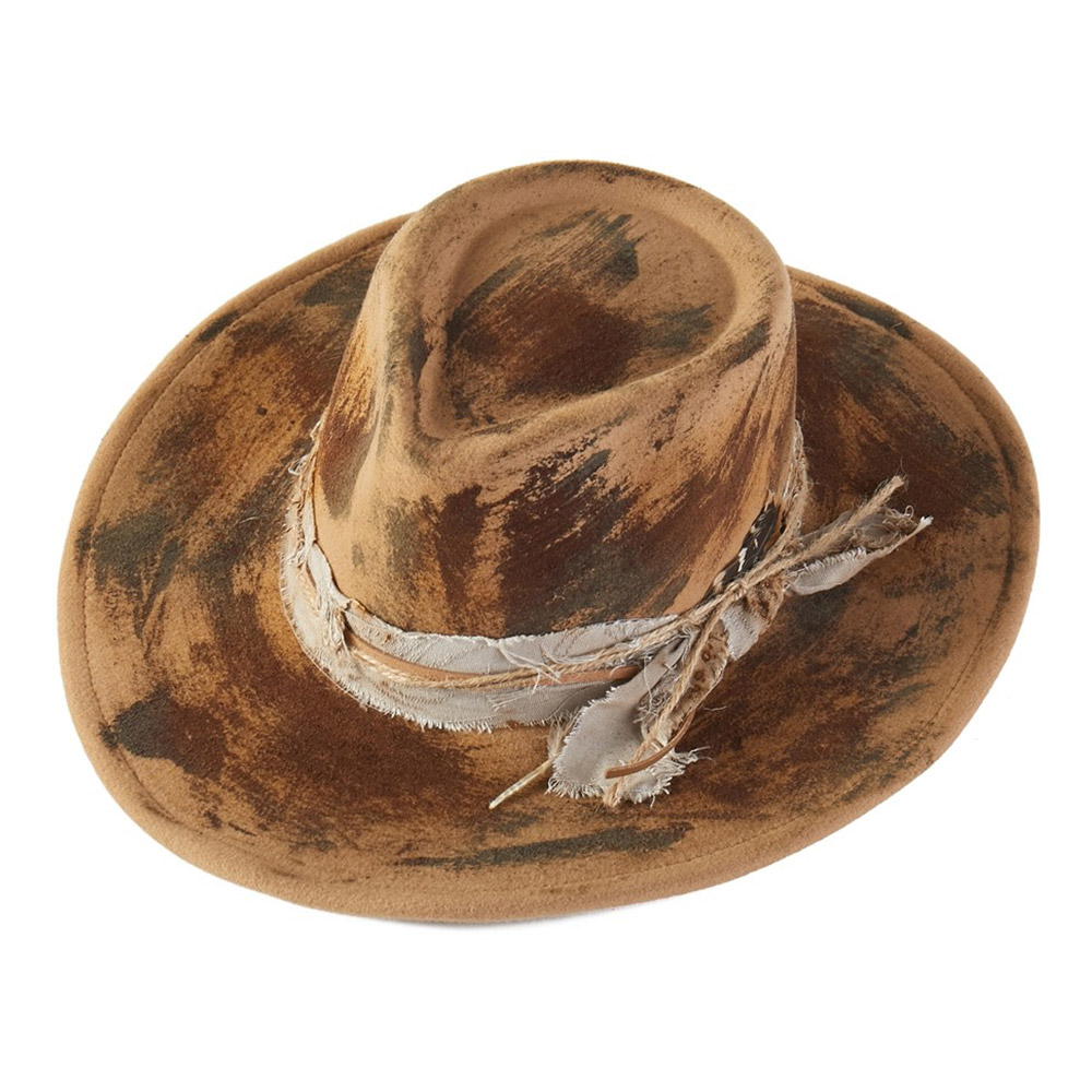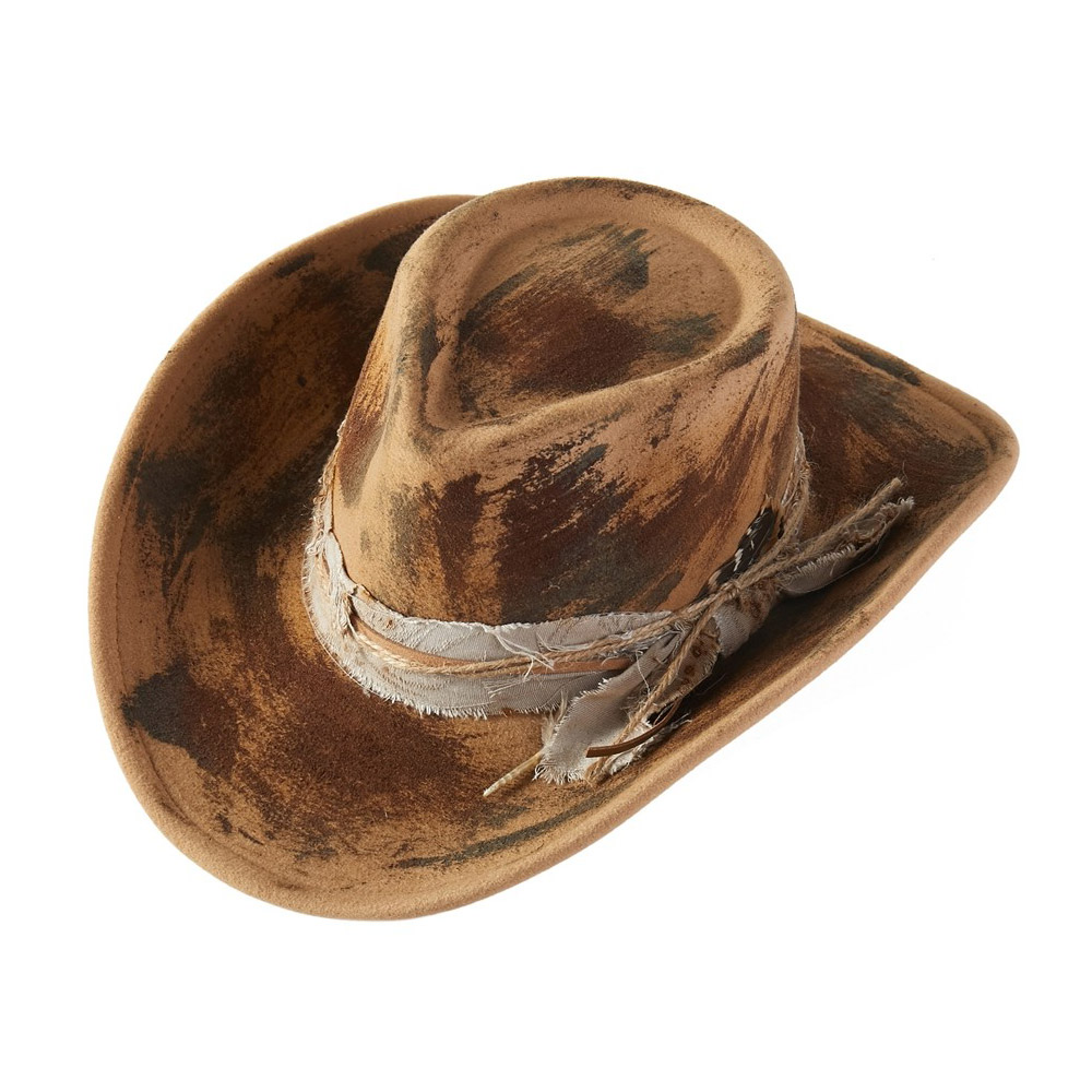 Details • Crown Circumference : 23" • Crown Height : 4.5" • Brim Height : 3.75" • Material : 100% Polyester • Embrace rustic charm with the Distressed Western Hat, featuring a vintage-inspired design with feather and ribbon accents. Its weathered finish adds authentic character, making it perfect for festivals, travel, or everyday wear that showcases effortless western style and confidence.