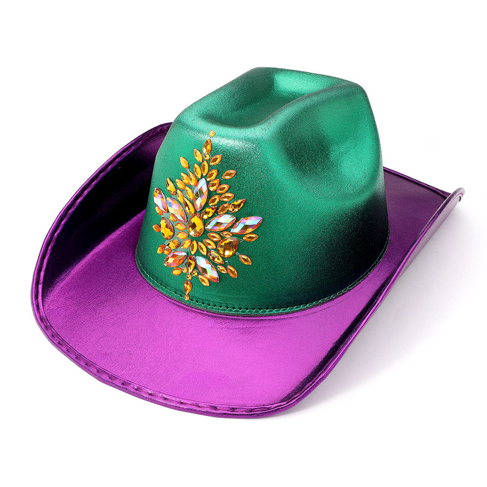 Details • Crown Circumference : 23" • Crown Height : 4" • Brim Height : 3" • Festive cowboy-style hat designed for parades, themed parties, and carnival celebrations. Features a decorative sequin design and structured western shape that elevates costumes, group outfits, photo ops, and event styling with bold, playful flair.