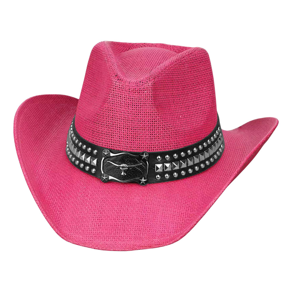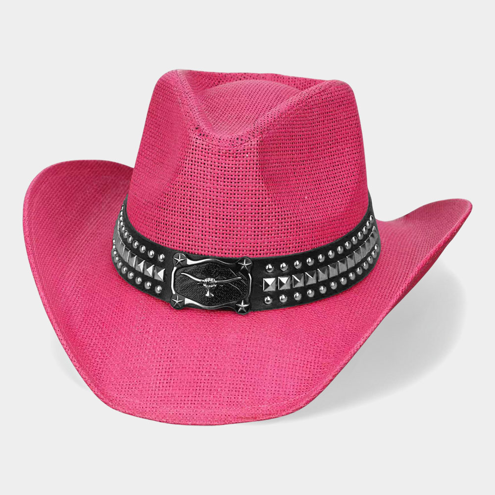 Metal Steer Head Buckle Studded Faux Leather Band Western Straw Cowboy Hat