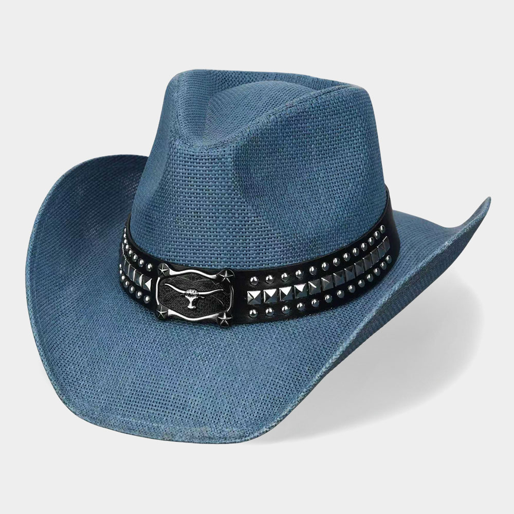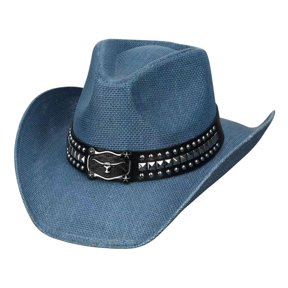Metal Steer Head Buckle Studded Faux Leather Band Western Straw Cowboy Hat