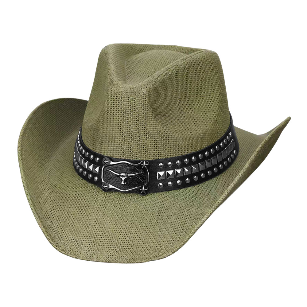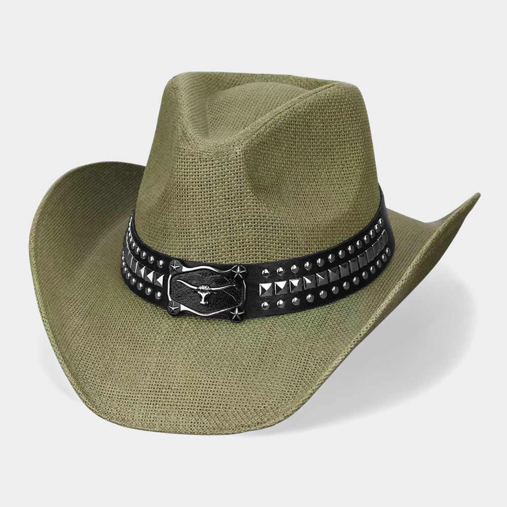 Metal Steer Head Buckle Studded Faux Leather Band Western Straw Cowboy Hat
