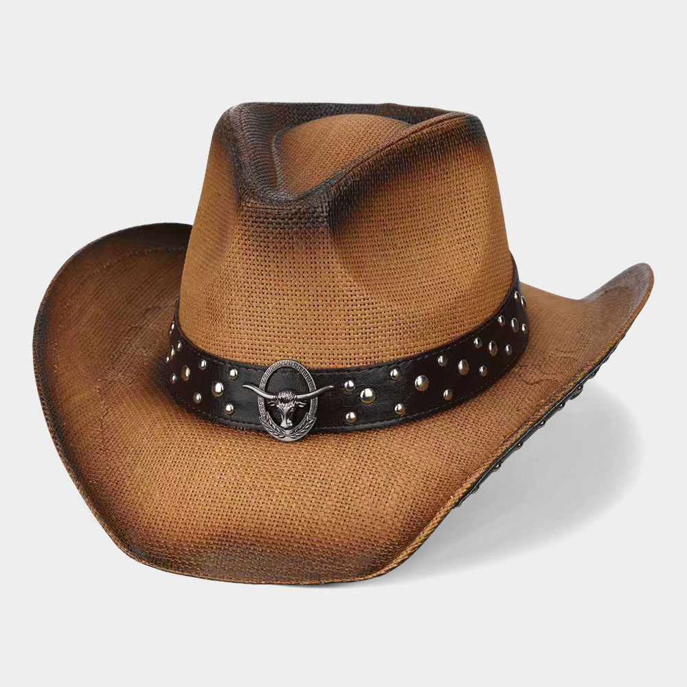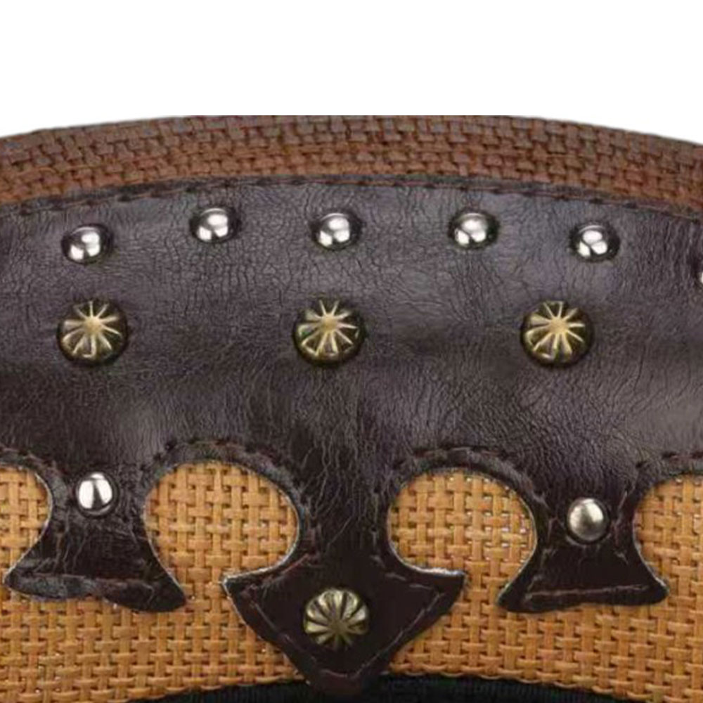 Metal Steer Head Emblem Studded Faux Leather Band Western Straw Cowboy Fedora Hat