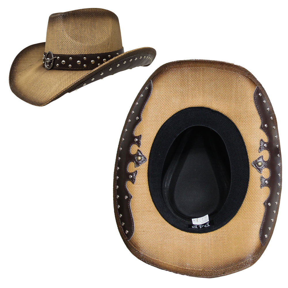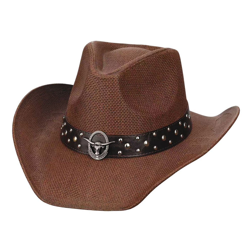 Metal Steer Head Emblem Studded Faux Leather Band Western Straw Cowboy Fedora Hat