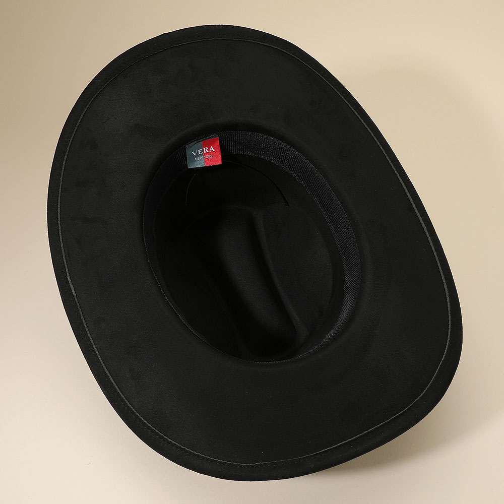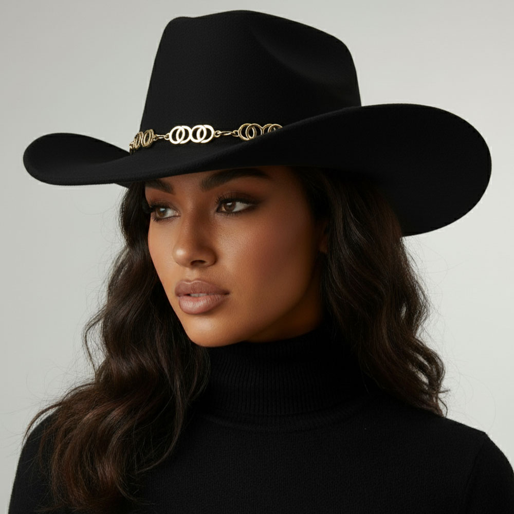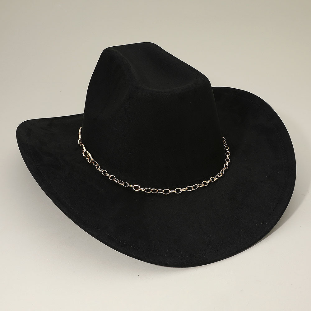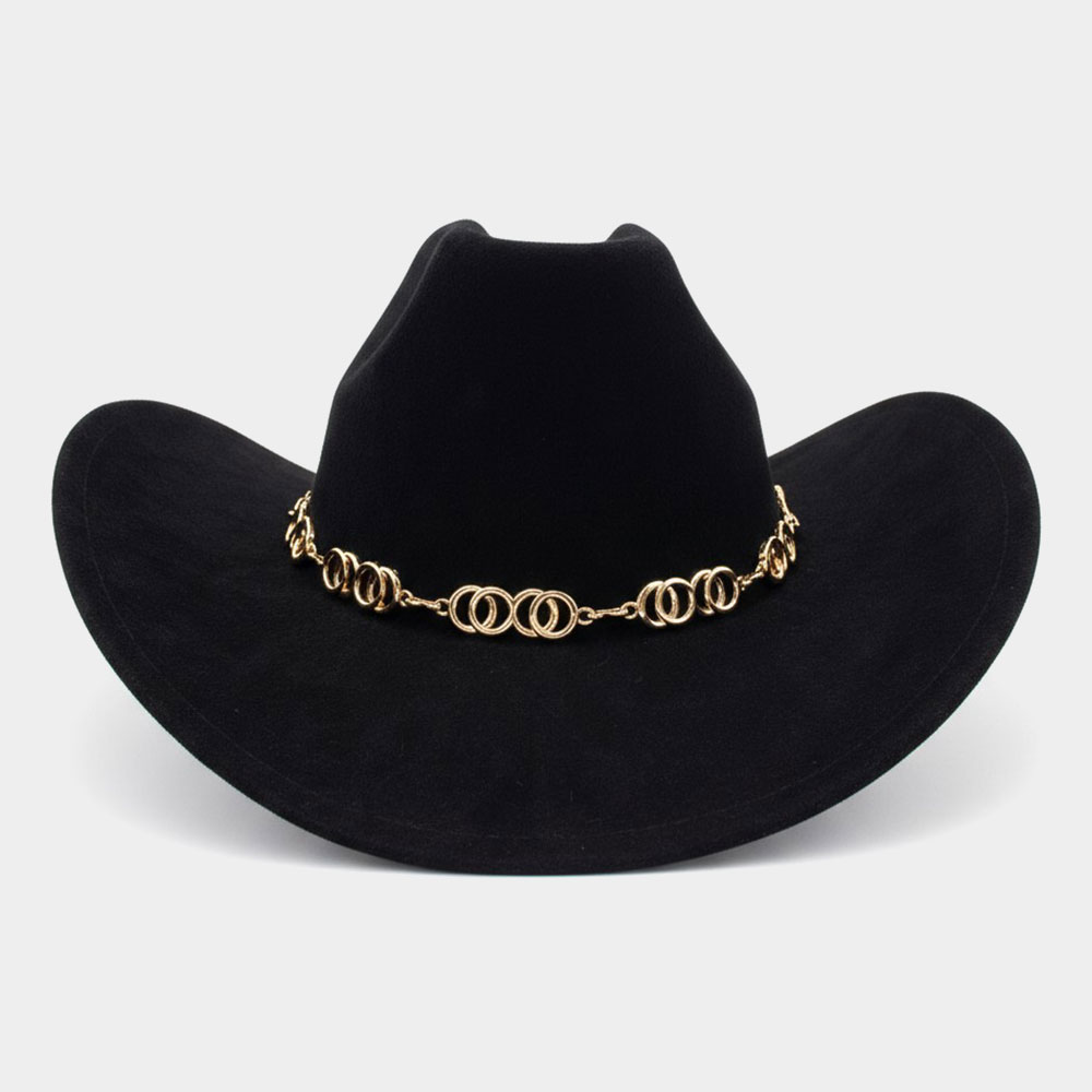 Details • Crown Circumference: 23" • Crown Height : 4.75" • Brim Width : 3.25" • Material : 100% Polyester • Refine your style with this bold Western-inspired hat featuring a striking curved brim and an elegant chain detail that adds a luxe touch. Designed to elevate festival looks, evening outfits, or everyday flair, it delivers a standout silhouette that blends classic attitude with modern sophistication.