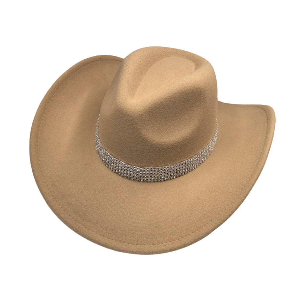 Details • Crown Circumference : 23" • Crown Height : 4.75" • Brim Height : 3.5" • Material : 100% Polyester • Make a striking impression with this wide-brim statement cowboy fedora hat featuring a glimmering crystal band. Designed for timeless elegance and modern sophistication, it adds a touch of glamour to any outfit—perfect for upscale events, travel, or fashionable daywear.