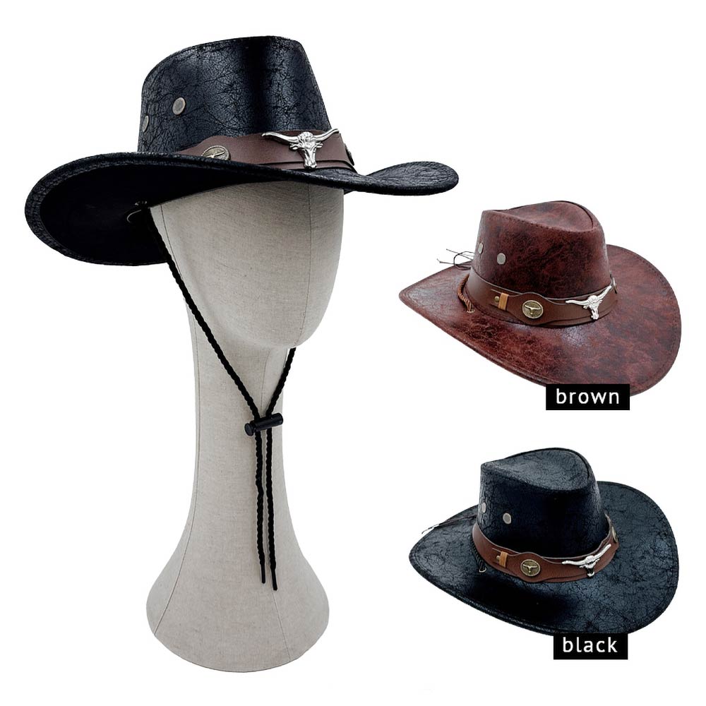Details • Size : One Size • Material : 100% Polyester • Add rugged western flair with this cowboy hat featuring a structured crown, wide brim, and decorative band with bull skull accents. Ideal for rodeos, country concerts, festivals, themed events, or western-inspired styling, it delivers bold character and standout appeal for everyday or special occasions.