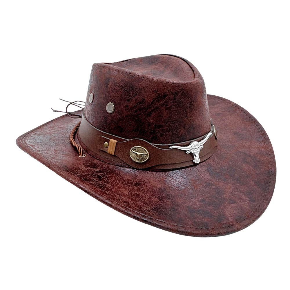• Add rugged western flair with this cowboy hat featuring a structured crown, wide brim, and decorative band with bull skull accents. Ideal for rodeos, country concerts, festivals, themed events, or western-inspired styling, it delivers bold character and standout appeal for everyday or special occasions.