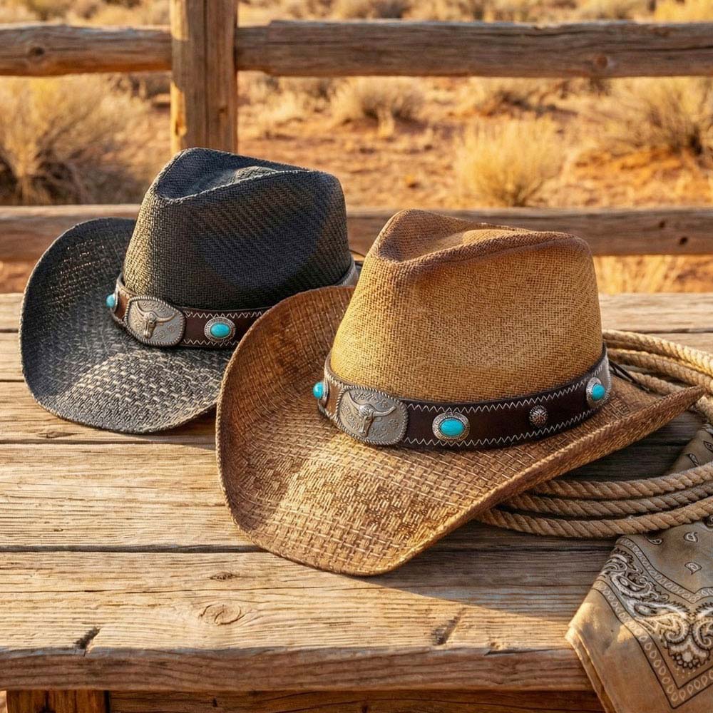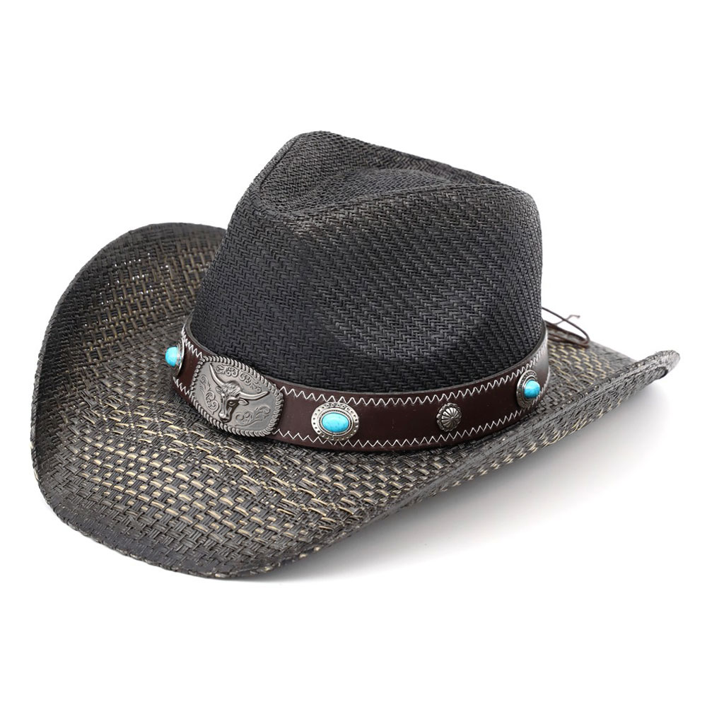 Steer Head Buckle Accent Turquoise Stone Concho Faux Leather Band Western Straw Cowboy Hat
