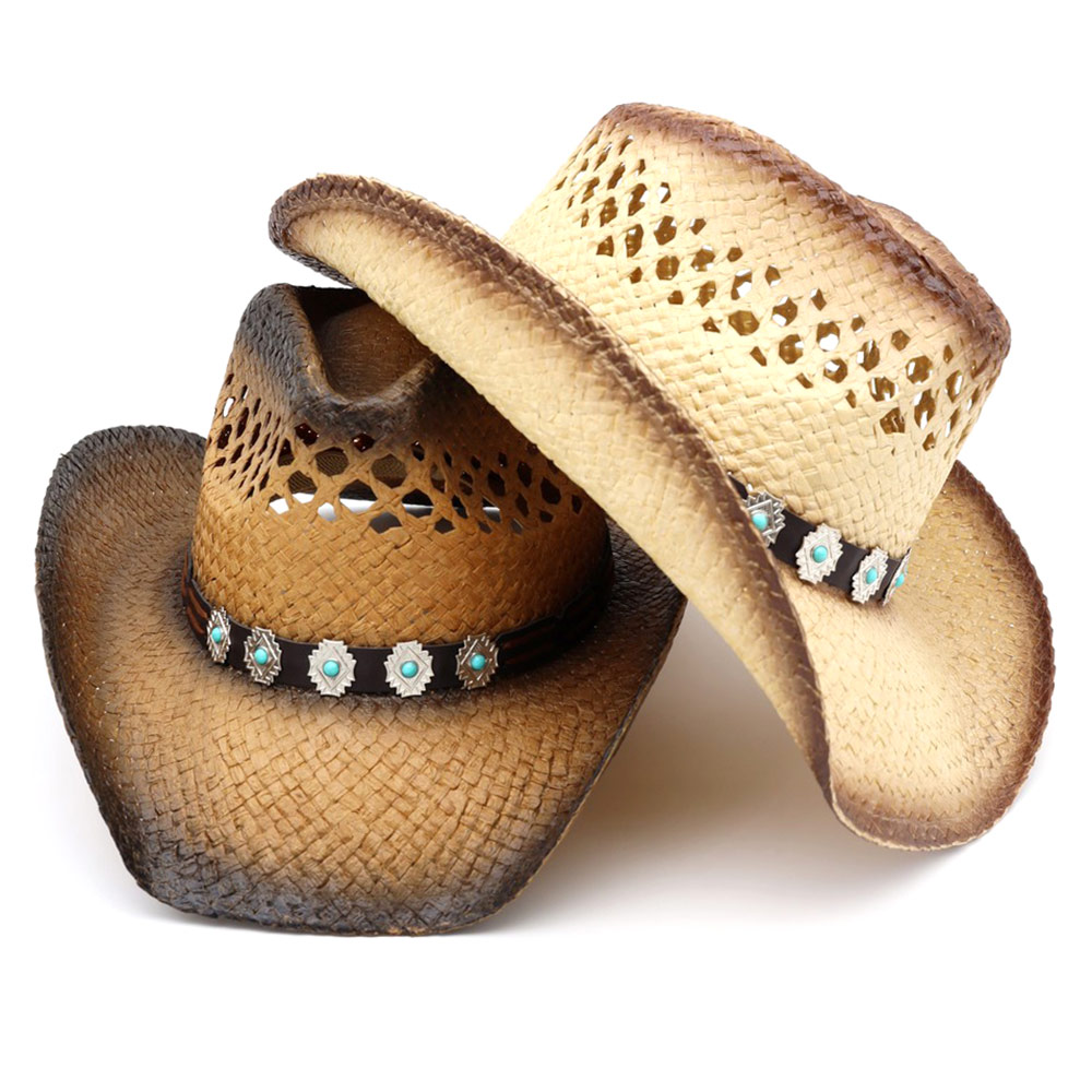 Turquoise Stone Faux Leather Band Aged Look Two Tone Western Woven Cowboy Hat