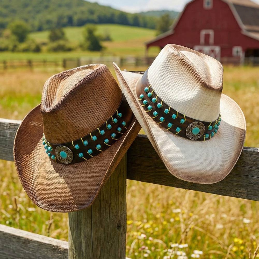 Details • Size : One Size • Material : 100% Paper • Eye-catching western cowboy hat featuring a beaded concho accent band that adds bold character and charm. Designed with a structured crown and curved brim, this statement hat is perfect for festivals, rodeos, concerts, country events, themed outfits, and standout everyday western looks.