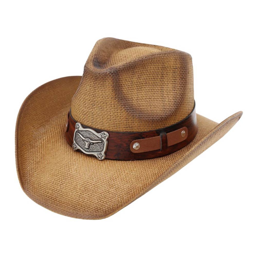 Details • Size : One Size • Material : 100% Paper • Classic western cowboy hat designed with a bold longhorn buckle accent band for a rugged, iconic look. Features a structured crown and curved brim that elevate rodeo outfits, country concerts, festivals, western-themed events, and everyday statement styling with timeless cowboy appeal.